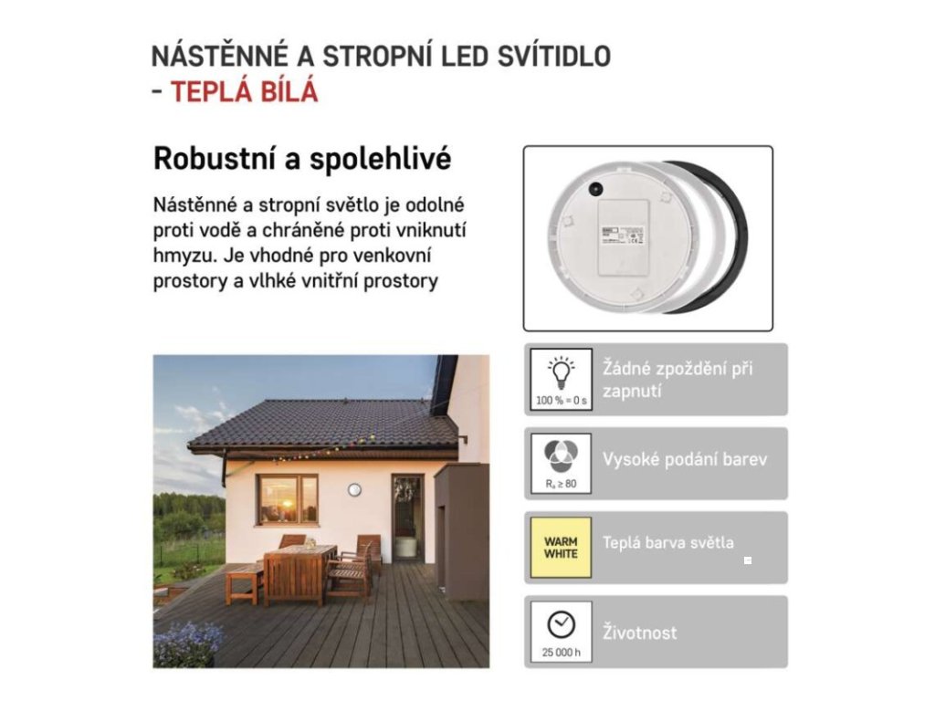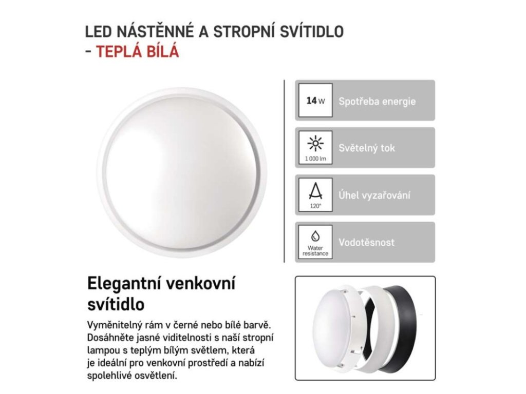barva světla: teplá bílá|barva těla: černá/bílá|dálkový ovladač: ne|do chodby a na schodiště: ano|do dílny a garáže: ano|do kanceláře: ne|do koupelny: ano|do kuchyně: ne|do obýváku, ložnice a dětského pokoje: ne|dosah senzoru: nemá senzor|flicker-free: ano|frekvence: 50/60 Hz|index podání barev (CRI): Ra > 80|kategorie: CLASSIC|krytí: IP54|materiál difuzoru: plast (PC)|materiál LGP: neuvádí se|materiál těla: plast (PC)|montážní otvor: neuvádí se|možnost stmívání: ne|náhrada za žárovku: 70 W|napětí: 220–240 V|na zahradu a balkon: ano|pohybový senzor: ne|příkon: 14 W|prodejní obal: 1 ks, krabice|proud: 120 mA|řada: ZURI|rozměr: průměr 215 × 80 mm|světelná účinnost: 71 lm/W|světelný tok: 1 000 lm|teplota chromatičnosti: 3 000 K|tvar: kruh|typ difuzoru: mléčný|typ svítidla: klasické svítidlo|účiník: > 0,5|UGR<: neuvádí se|úhel vyzařování: 120°|umístění: stropní/nástěnné|výstupní proud ze zdroje: neuvádí se|záruční doba: 2 roky|zdroj světla: LED|životnost: 25 000 hodin|způsob montáže: přisazenéDoplňkové parametry