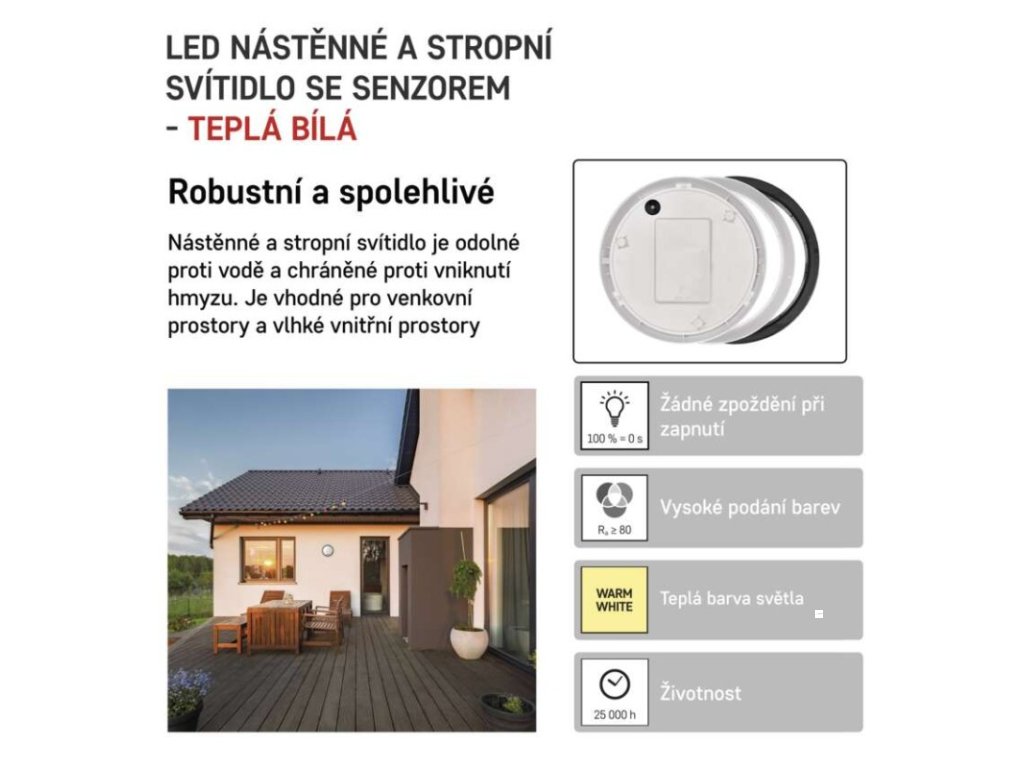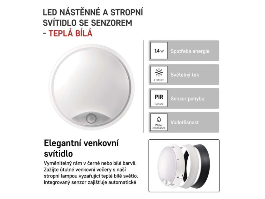barva světla: teplá bílá|barva těla: černá/bílá|dálkový ovladač: ne|do chodby a na schodiště: ano|do dílny a garáže: ano|do kanceláře: ne|do koupelny: ano|do kuchyně: ne|do obýváku, ložnice a dětského pokoje: ne|dosah senzoru: 10 m|flicker-free: ano|frekvence: 50/60 Hz|index podání barev (CRI): Ra > 80|kategorie: CLASSIC|krytí: IP54|materiál difuzoru: plast (PC)|materiál LGP: neuvádí se|materiál těla: plast (PC)|montážní otvor: neuvádí se|možnost stmívání: ne|náhrada za žárovku: 75 W|napětí: 220–240 V|na zahradu a balkon: ano|pohybový senzor: PIR|příkon: 14 W|prodejní obal: 1 ks, krabice|proud: 120 mA|řada: ZURI|rozměr: průměr 215 × 80 mm|světelná účinnost: 71 lm/W|světelný tok: 1 000 lm|teplota chromatičnosti: 3 000 K|tvar: kruh|typ difuzoru: mléčný|typ svítidla: klasické svítidlo|účiník: > 0,5|UGR<: neuvádí se|úhel vyzařování: 120°|umístění: nástěnné|výstupní proud ze zdroje: neuvádí se|záruční doba: 2 roky|zdroj světla: LED|životnost: 25 000 hodin|způsob montáže: přisazenéDoplňkové parametry