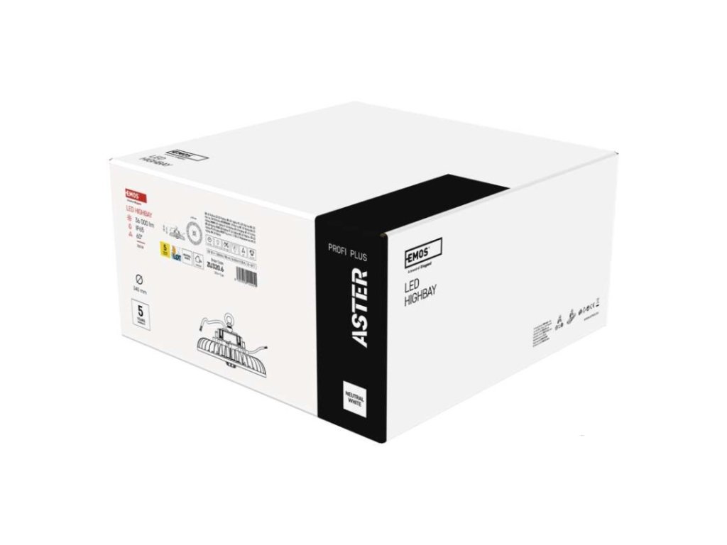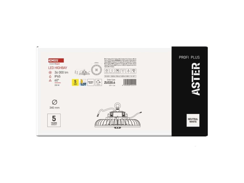 akumulátor: neuvádí se|barva: černá|barva světla: neutrální bílá|délka přívodního kabelu: 30 cm|doba svícení na AKU: neuvádí se|dosah PIR senzoru: nemá PIR|energetická třída použitého světelného zdroje: C|flicker-free: ano|frekvence: 50/60 Hz|index podání barev (CRI): Ra > 80|kategorie: PROFI PLUS|krytí: IP65|materiál difuzoru: plast (PC)|materiál přívodního kabelu: guma|materiál těla: hliník|napájení: ze sítě|napětí: 220–240 V~|PIR senzor: ne|počet průchozích zásuvek: neuvádí se|použití: závěsná montáž|příkon: 200 W|prodejní obal: 1 ks, krabice|proud: 980 mA|řada: ASTER|rozměr: průměr 340 × 178 mm|rozsah pracovní teploty: -35 °C až +50 °C|stmívání: ne|stupeň ochrany proti mechanickým nárazům: IK08|světelná účinnost: 180 lm/W|světelný tok: 36 000 lm|teplota chromatičnosti: 4 000 K|typ přívodního kabelu: neuvádí se|typ průchozích zásuvek: neuvádí se|typ stmívání: –|účiník: > 0,9|úhel vyzařování: 60°|záruční doba: 5 let|zdroj světla: LED|životnost: 50 000 hodin|zkušební žárovka součástí balení: neuvádí seDoplňkové parametry