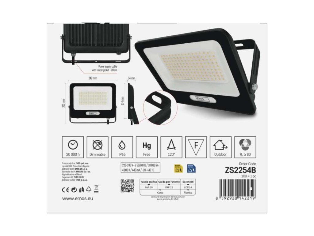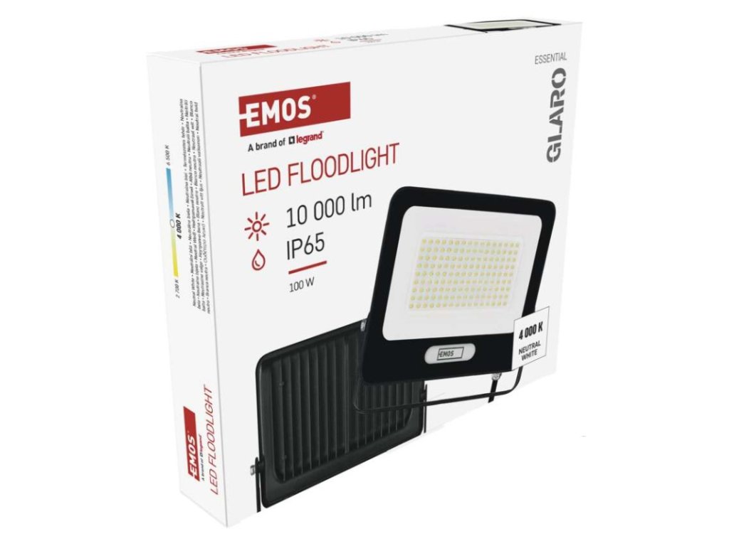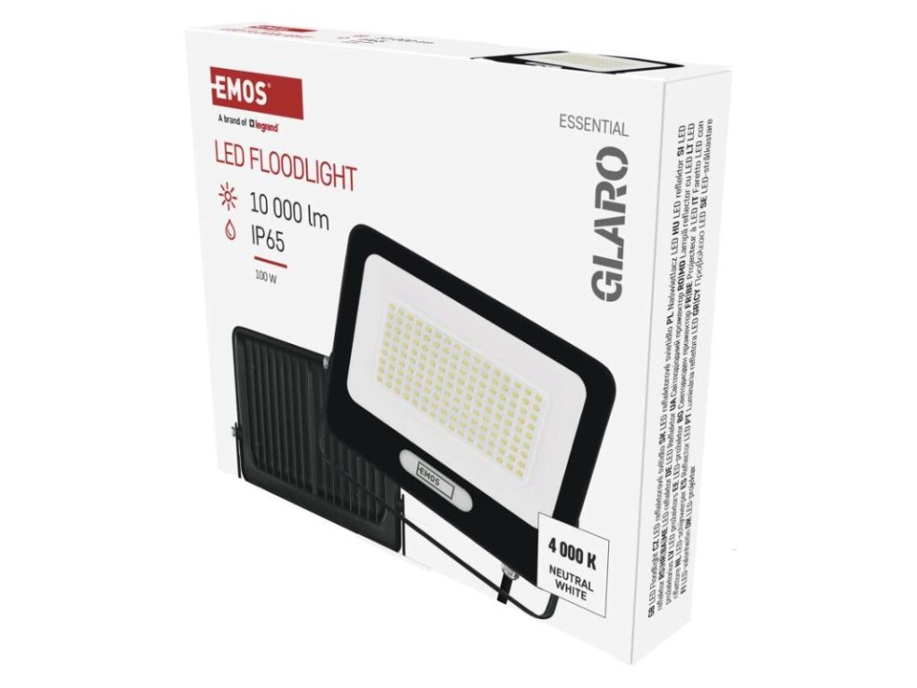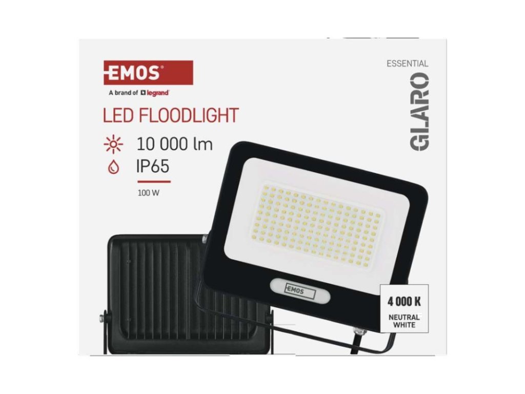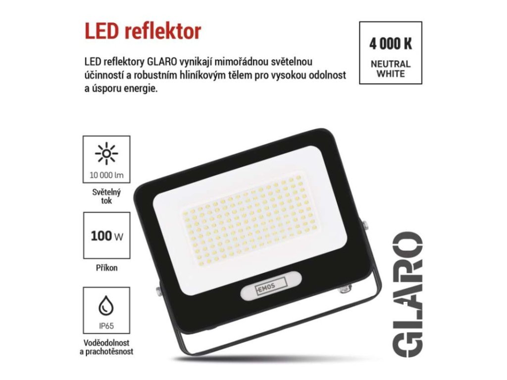 akumulátor: ne|barva: černá|barva světla: neutrální bílá|délka přívodního kabelu: 20 cm|doba svícení na AKU: –|dosah PIR senzoru: nemá PIR|energetická třída použitého světelného zdroje: F|flicker-free: ano|frekvence: 50/60 Hz|index podání barev (CRI): Ra > 80|kategorie: ESSENTIAL|krytí: IP65|materiál difuzoru: sklo|materiál přívodního kabelu: guma|materiál těla: hliník|napájení: ze sítě|napětí: 220–240 V~|PIR senzor: ne|počet průchozích zásuvek: –|použití: povrchová montáž|příkon: 100 W|prodejní obal: 1 ks, krabice|proud: 430 mA|řada: GLARO|rozměr: 242 × 203 × 34 mm|rozsah pracovní teploty: -20 °C až +40 °C|stmívání: ne|stupeň ochrany proti mechanickým nárazům: –|světelná účinnost: 100 lm/W|světelný tok: 10 000 lm|teplota chromatičnosti: 4 000 K|typ přívodního kabelu: H05RN-F|typ průchozích zásuvek: –|typ stmívání: –|účiník: > 0,9|úhel vyzařování: 120°|záruční doba: 2 roky|zdroj světla: LED|životnost: 20 000 hodin|zkušební žárovka součástí balení: neDoplňkové parametry