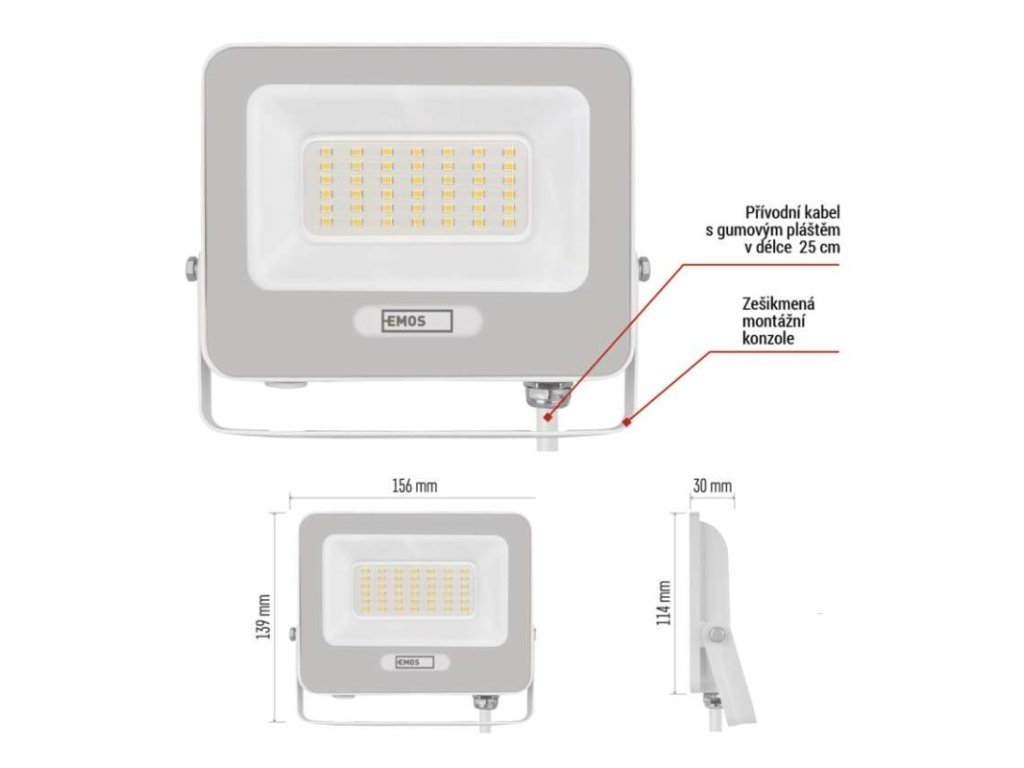 akumulátor: ne|barva: bílá|barva světla: neutrální bílá|délka přívodního kabelu: 20 cm|doba svícení na AKU: neuvádí se|dosah PIR senzoru: nemá PIR|energetická třída použitého světelného zdroje: F|flicker-free: ano|frekvence: 50/60 Hz|index podání barev (CRI): Ra > 80|kategorie: ESSENTIAL|krytí: IP65|materiál difuzoru: sklo|materiál přívodního kabelu: guma|materiál těla: hliník|napájení: ze sítě|napětí: 220–240 V~|PIR senzor: ne|počet průchozích zásuvek: neuvádí se|použití: povrchová montáž|příkon: 30 W|prodejní obal: 1 ks, krabice|proud: 130 mA|řada: GLARO|rozměr: 156 × 139 × 30 mm|rozsah pracovní teploty: -20 °C až +40 °C|stmívání: ne|stupeň ochrany proti mechanickým nárazům: neuvádí se|světelná účinnost: 100 lm/W|světelný tok: 3 000 lm|teplota chromatičnosti: 4 000 K|typ přívodního kabelu: H05RN-F|typ průchozích zásuvek: neuvádí se|typ stmívání: –|účiník: > 0,9|úhel vyzařování: 120°|záruční doba: 2 roky|zdroj světla: LED|životnost: 20 000 hodin|zkušební žárovka součástí balení: neDoplňkové parametry