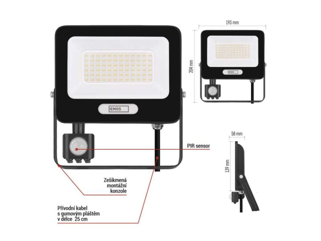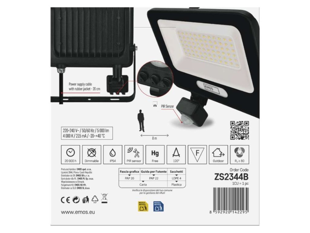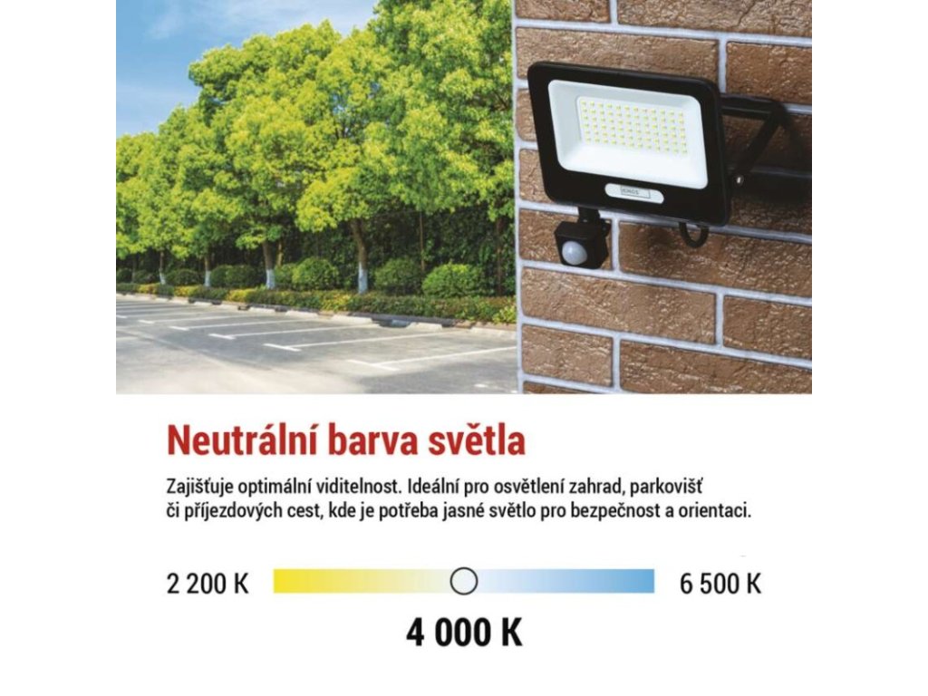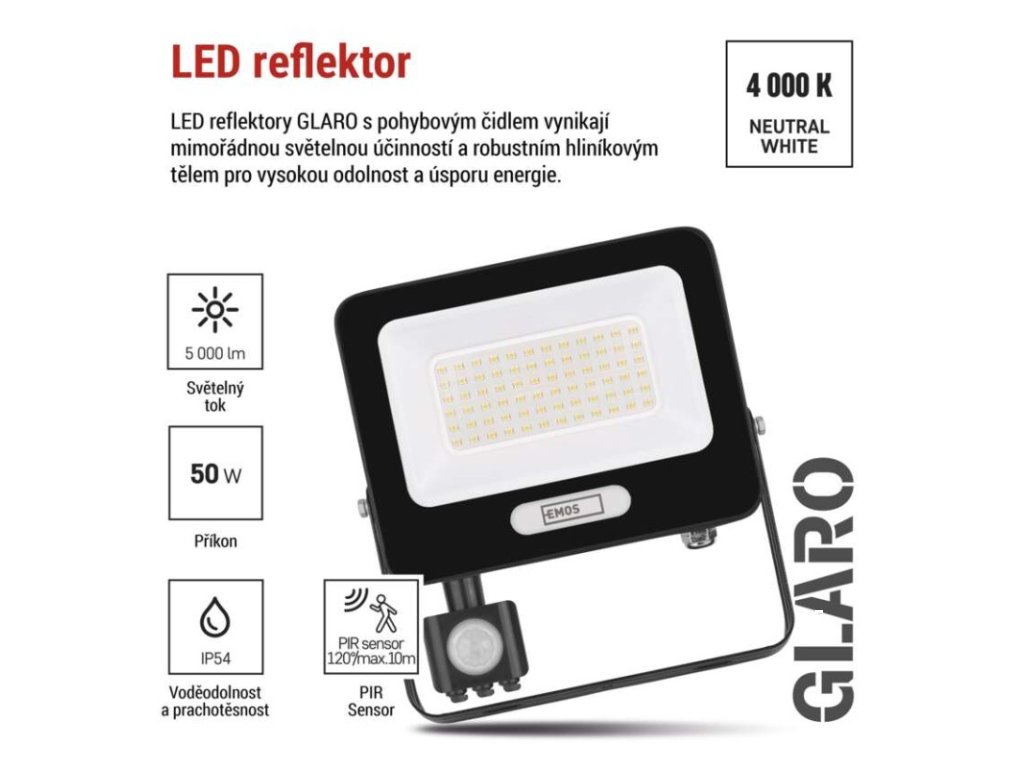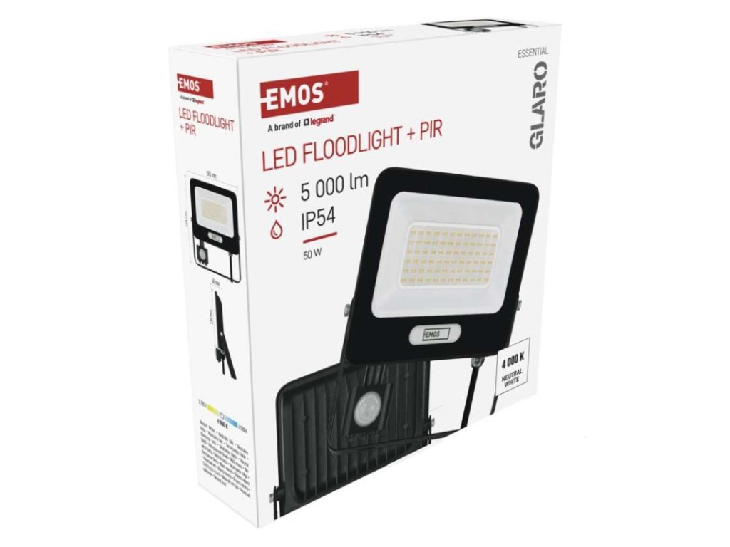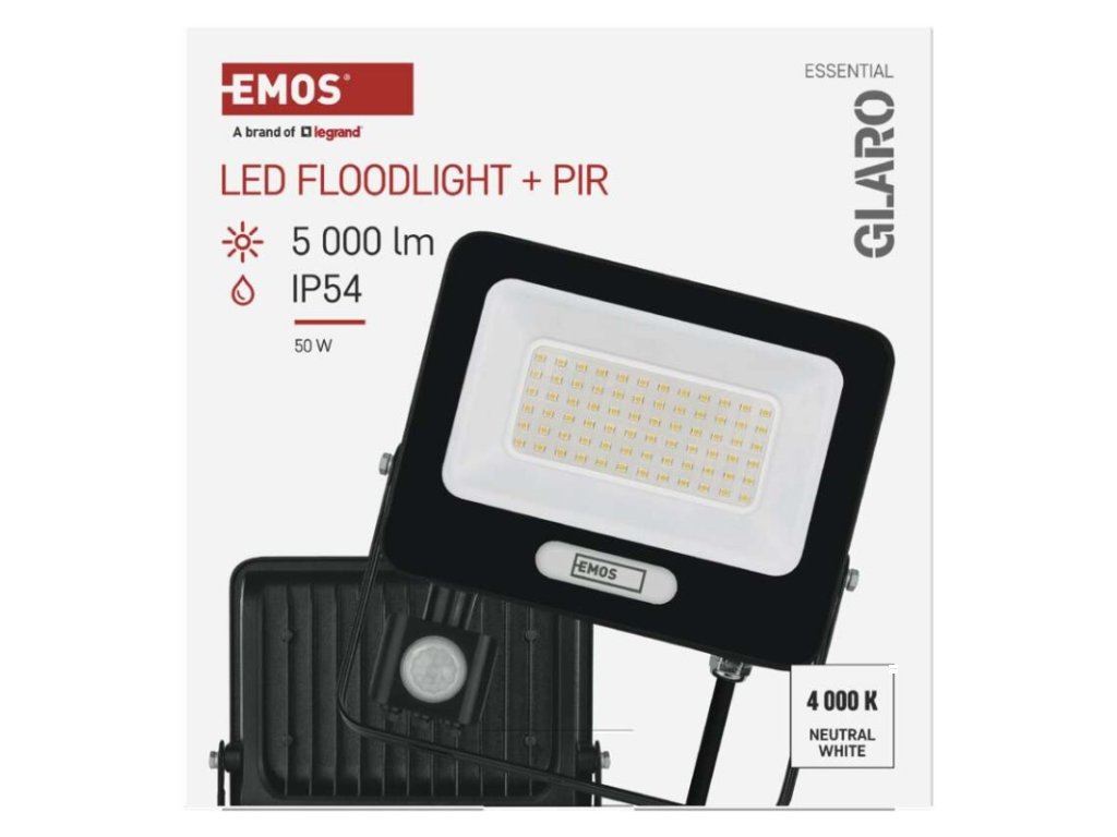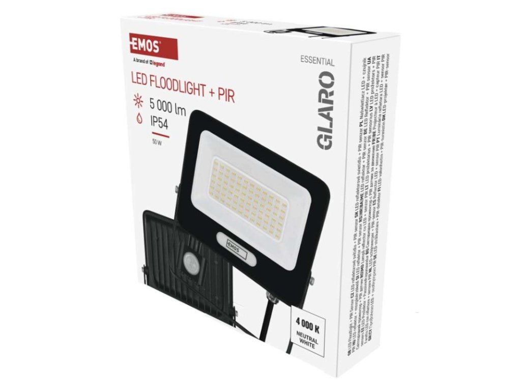 akumulátor: ne|barva: černá|barva světla: neutrální bílá|délka přívodního kabelu: 20 cm|doba svícení na AKU: –|dosah PIR senzoru: 8 m|energetická třída použitého světelného zdroje: F|flicker-free: ano|frekvence: 50/60 Hz|index podání barev (CRI): Ra > 80|kategorie: ESSENTIAL|krytí: IP54|materiál difuzoru: sklo|materiál přívodního kabelu: guma|materiál těla: hliník|napájení: ze sítě|napětí: 220–240 V~|PIR senzor: ano|počet průchozích zásuvek: –|použití: povrchová montáž|příkon: 50 W|prodejní obal: 1 ks, krabice|proud: 215 mA|řada: GLARO|rozměr: 193 × 204 × 58 mm|rozsah pracovní teploty: -20 °C až +40 °C|stmívání: ne|stupeň ochrany proti mechanickým nárazům: –|světelná účinnost: 100 lm/W|světelný tok: 5 000 lm|teplota chromatičnosti: 4 000 K|typ přívodního kabelu: H05RN-F|typ průchozích zásuvek: –|typ stmívání: –|účiník: > 0,9|úhel vyzařování: 120°|záruční doba: 2 roky|zdroj světla: LED|životnost: 20 000 hodin|zkušební žárovka součástí balení: neDoplňkové parametry