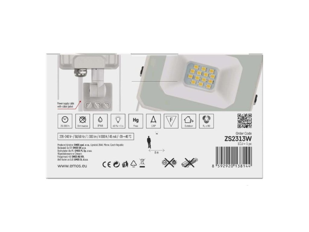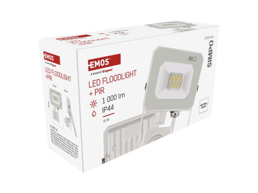 akumulátor: ne|barva: bílá|barva světla: neutrální bílá|délka přívodního kabelu: 20 cm|doba svícení na AKU: neuvádí se|dosah PIR senzoru: 8 m|energetická třída použitého světelného zdroje: –|flicker-free: ano|frekvence: 50/60 Hz|index podání barev (CRI): Ra > 80|kategorie: ESSENTIAL|krytí: IP44|materiál difuzoru: sklo|materiál přívodního kabelu: guma|materiál těla: hliník|napájení: ze sítě|napětí: 220–240 V~|PIR senzor: ano|počet průchozích zásuvek: neuvádí se|použití: povrchová montáž|příkon: 10 W|prodejní obal: 1 ks, krabice|proud: 45 mA|řada: SIMPO|rozměr: 85 × 141 × 52 mm|rozsah pracovní teploty: -20 °C až +40 °C|stmívání: ne|stupeň ochrany proti mechanickým nárazům: neuvádí se|světelná účinnost: 100 lm/W|světelný tok: 1 000 lm|teplota chromatičnosti: 4 000 K|typ přívodního kabelu: H05RN-F|typ průchozích zásuvek: neuvádí se|typ stmívání: –|účiník: > 0,5|úhel vyzařování: 120°|záruční doba: 2 roky|zdroj světla: LED|životnost: 15 000 hodin|zkušební žárovka součástí balení: neDoplňkové parametry