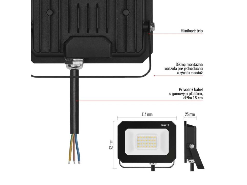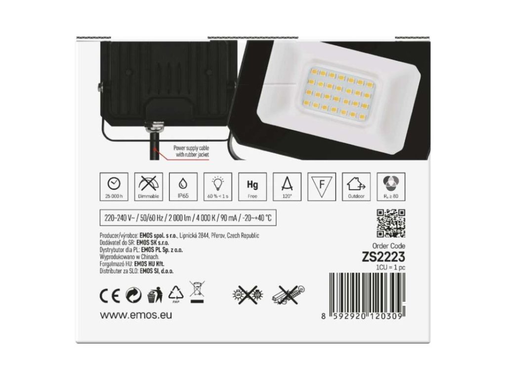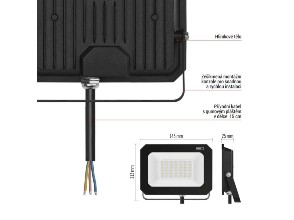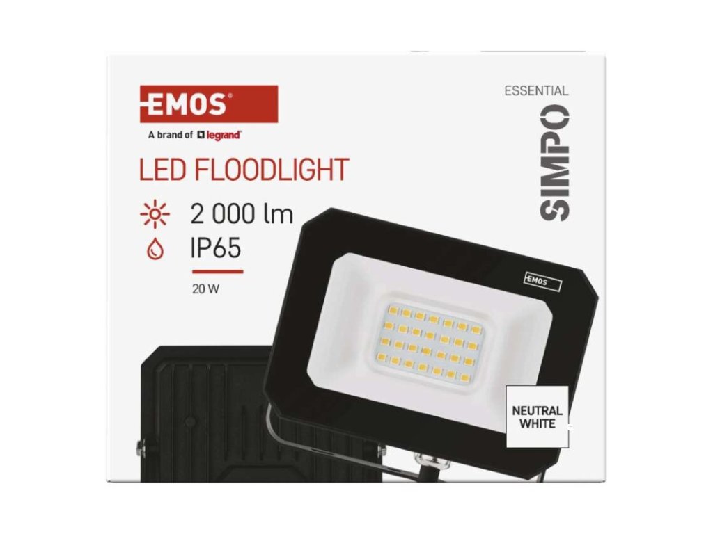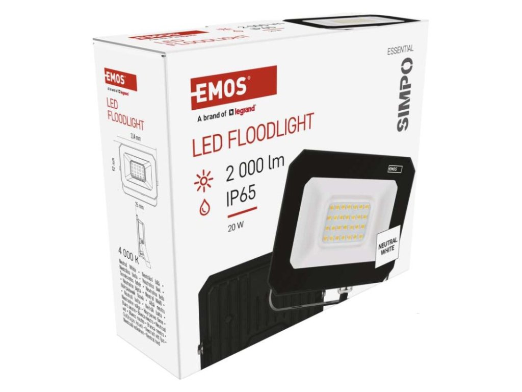 akumulátor: ne|barva: černá|barva světla: neutrální bílá|délka přívodního kabelu: 20 cm|doba svícení na AKU: neuvádí se|dosah PIR senzoru: nemá PIR|energetická třída použitého světelného zdroje: –|flicker-free: ano|frekvence: 50/60 Hz|index podání barev (CRI): Ra > 80|kategorie: ESSENTIAL|krytí: IP65|materiál difuzoru: sklo|materiál přívodního kabelu: guma|materiál těla: hliník|napájení: ze sítě|napětí: 220–240 V~|PIR senzor: ne|počet průchozích zásuvek: neuvádí se|použití: závěsná montáž|příkon: 20 W|prodejní obal: 1 ks, krabice|proud: 90 mA|řada: SIMPO|rozměr: 114 × 92 × 25 mm|rozsah pracovní teploty: -20 °C až +40 °C|stmívání: ne|stupeň ochrany proti mechanickým nárazům: neuvádí se|světelná účinnost: 100 lm/W|světelný tok: 2 000 lm|teplota chromatičnosti: 4 000 K|typ přívodního kabelu: H05RN-F|typ průchozích zásuvek: neuvádí se|účiník: > 0,7|úhel vyzařování: 120°|záruční doba: 2 roky|zdroj světla: LED|životnost: 25 000 hodin|zkušební žárovka součástí balení: neDoplňkové parametry