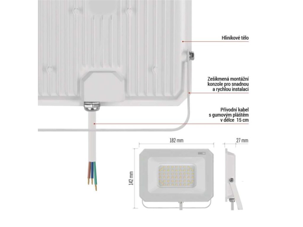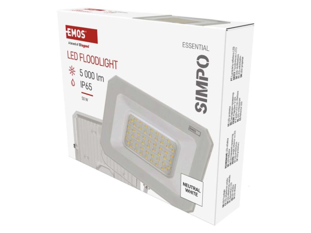 akumulátor: ne|barva: bílá|barva světla: neutrální bílá|délka přívodního kabelu: 20 cm|doba svícení na AKU: neuvádí se|dosah PIR senzoru: nemá PIR|energetická třída použitého světelného zdroje: –|flicker-free: ano|frekvence: 50/60 Hz|index podání barev (CRI): Ra > 80|kategorie: ESSENTIAL|krytí: IP65|materiál difuzoru: sklo|materiál přívodního kabelu: guma|materiál těla: hliník|napájení: ze sítě|napětí: 220–240 V~|PIR senzor: ne|počet průchozích zásuvek: neuvádí se|použití: povrchová montáž|příkon: 50 W|prodejní obal: 1 ks, krabice|proud: 215 mA|řada: SIMPO|rozměr: 182 × 142 × 27 mm|rozsah pracovní teploty: -20 °C až +40 °C|stmívání: ne|stupeň ochrany proti mechanickým nárazům: neuvádí se|světelná účinnost: 100 lm/W|světelný tok: 5 000 lm|teplota chromatičnosti: 4 000 K|typ přívodního kabelu: H05RN-F|typ průchozích zásuvek: neuvádí se|typ stmívání: –|účiník: > 0,9|úhel vyzařování: 120°|záruční doba: 2 roky|zdroj světla: LED|životnost: 15 000 hodin|zkušební žárovka součástí balení: neDoplňkové parametry