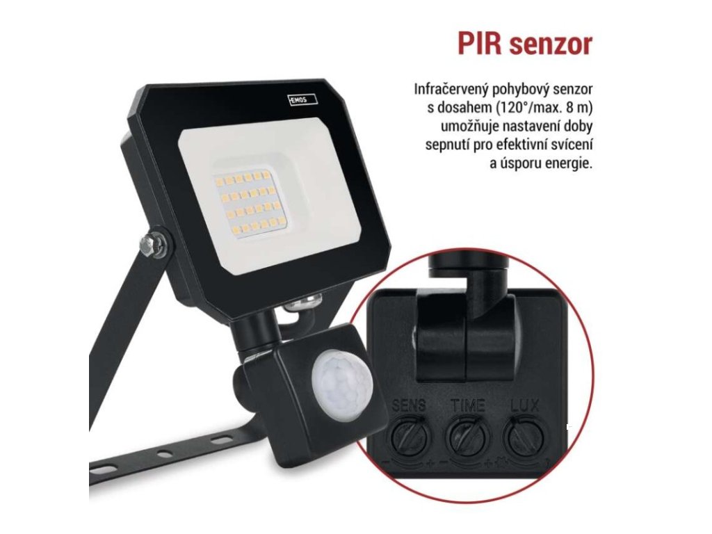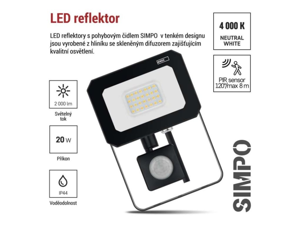 LED reflektor SIMPO s pohybovým čidlem, 20 W, černý, neutrální bílá