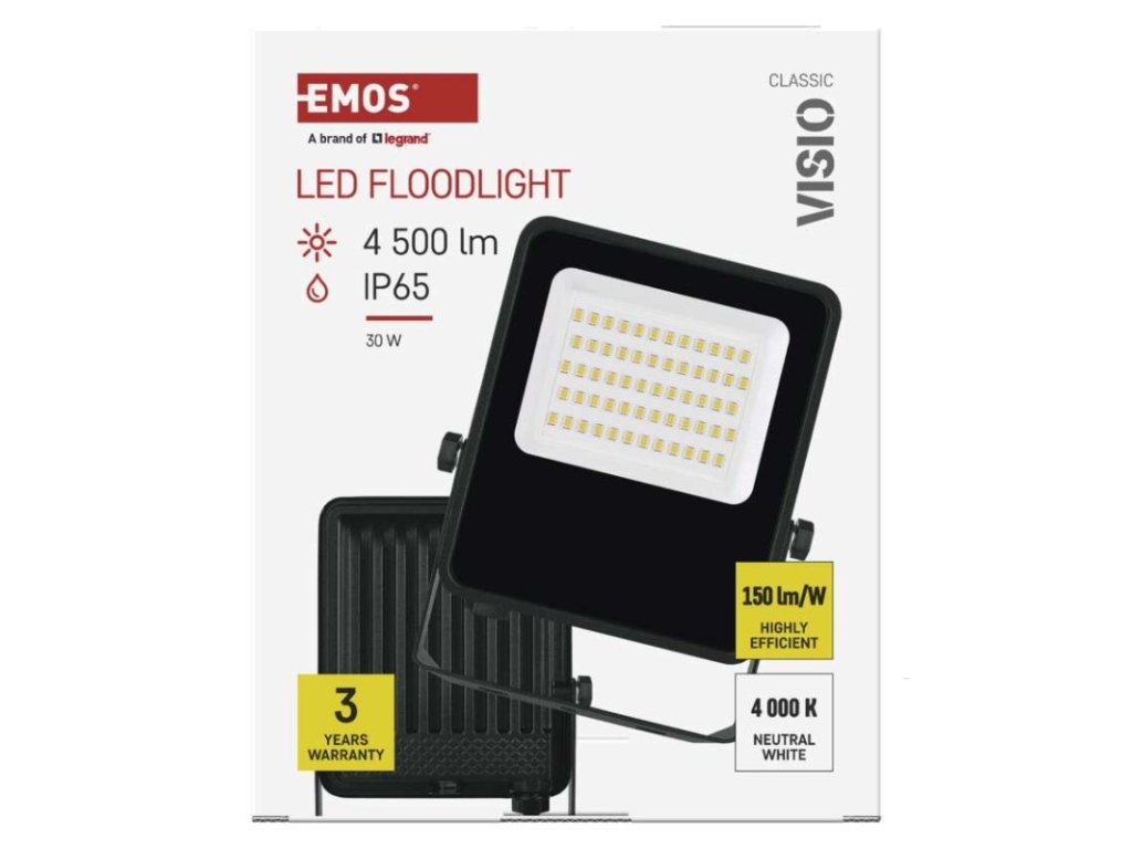 akumulátor: ne|barva: černá|barva světla: neutrální bílá|délka přívodního kabelu: 25 cm|doba svícení na AKU: –|dosah PIR senzoru: nemá PIR|energetická třída použitého světelného zdroje: –|flicker-free: ano|frekvence: 50/60 Hz|index podání barev (CRI): Ra > 80|kategorie: CLASSIC|krytí: IP65|materiál difuzoru: sklo|materiál přívodního kabelu: guma|materiál těla: hliník|napájení: ze sítě|napětí: 220–240 V~|PIR senzor: ne|počet průchozích zásuvek: –|použití: povrchová montáž|příkon: 30 W|prodejní obal: 1 ks, krabice|proud: 135 mA|řada: VISIO|rozměr: 163 × 135 × 22 mm|rozsah pracovní teploty: -20 °C až +40 °C|stmívání: ne|stupeň ochrany proti mechanickým nárazům: IK06|světelná účinnost: 150 lm/W|světelný tok: 4 500 lm|teplota chromatičnosti: 4 000 K|typ přívodního kabelu: H05RN-F|typ průchozích zásuvek: –|typ stmívání: –|účiník: > 0,9|úhel vyzařování: 110°|záruční doba: 3 roky|zdroj světla: LED|životnost: 36 000 hodin|zkušební žárovka součástí balení: neDoplňkové parametry