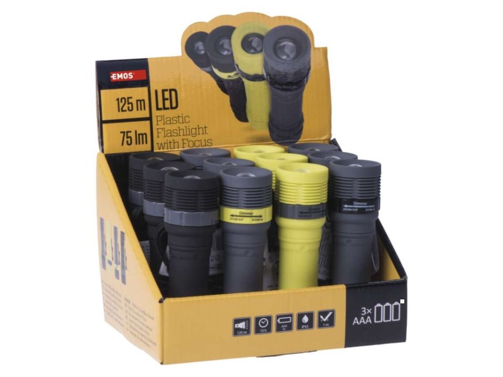barva: žlutá – šedý kroužek; šedá – žlutý kroužek; černá – šedý kroužek; šedá – černý kroužek|baterie součástí balení: ano|doba nabíjení: neuvádí se|doba svícení: 15 h|doba svícení detail: LED 100 % – 15 h|dosvit: 125 m (max. zoom), 45 m (min. zoom)|fokus: ano|hmotnost: 83 g|LED indikace nabíjení: neuvádí se|LED indikace stavu akumulátoru: neuvádí se|materiál: ABS plast|maximální dosvit: 125 m|maximální světelný tok: 75 lm|nabíjecí: ne|napájení: 3× AAA|nárazuvzdornost: ano|počet režimů svícení: 1|příslušenství: neuvádí se|prodejní obal: 12 ks, display box|režimy svícení: LED 100 %|rozměr: 120 × 35 × 35 mm|speciální funkce: neuvádí se|světelný tok: LED 100 % – 75 lm|typ baterie: LR03 (1,5 V)|typ napájecího konektoru: neuvádí se|voděodolnost: ano (IP43)|vybavení: poutko|záruční doba: 2 roky|zdroj světla: LED|značka: EMOSDoplňkové parametry