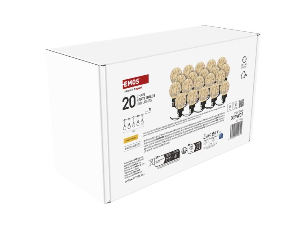 LED světelný řetěz – 20x párty žárovky, 7,6 m, venkovní i vnitřní, teplá bílá