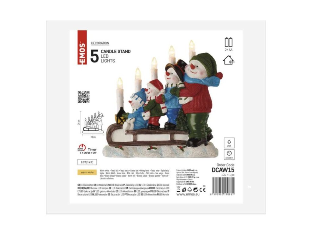 LED svícen – sněhuláci na saních, 24 cm, 2x AA, vnitřní, teplá bílá, časovač