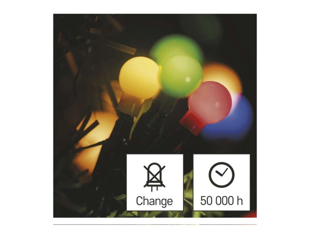 barva drátu: zelená|barva světla: multicolor|časovač: ano|dálkový ovladač: ne|další funkce: –|délka přívodu: 5 m|funkce: 8 módů (multifunkce)|jazyky aplikace: –|kompatibilita: –|krytí: IP44|LED mezera: 10 cm|materiál: PVC|možnost propojení: ne|notifikace do mobilní aplikace: ne|ovládání hlasovými asistenty: ne|počet LED: 300|podporované OS: –|použití: venkovní i vnitřní|přenosová frekvence: –|příkon: 6 W|prodejní obal: 1 ks, krabice|produkt: řetěz|protokol: –|pro výšku stromu: 250 cm|rozměr: 30 m|tvar: kulička|typ napájení: síťový adaptér|velikost LED: 10 mm|vstupní napětí: 230 V AC|výstupní napětí: 31 V DC|záruční doba: 2 roky|životnost: 10 000 hodinDoplňkové parametry