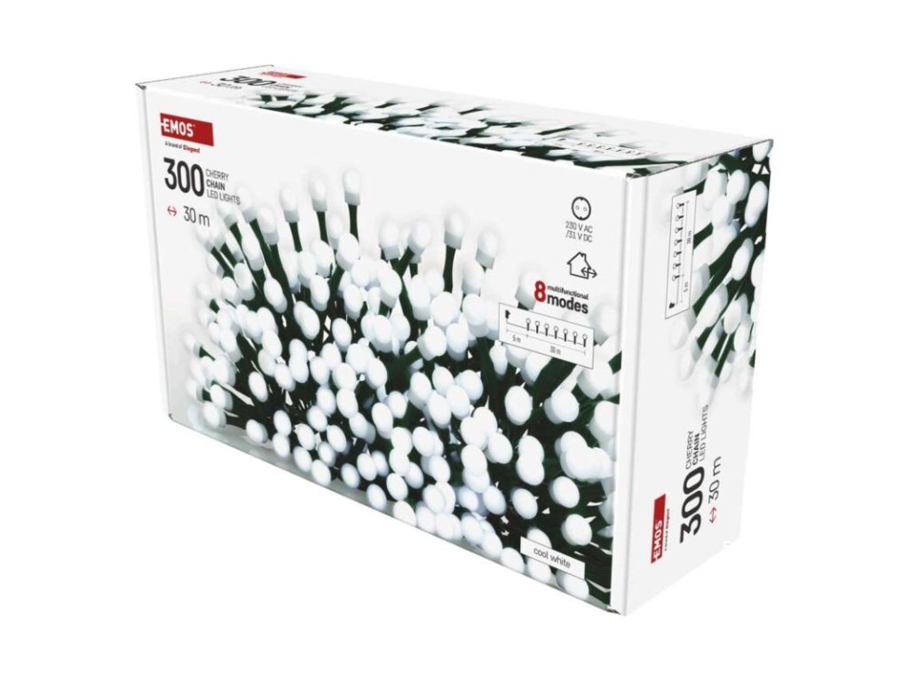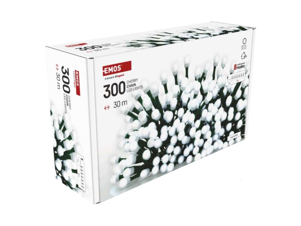 LED vánoční cherry řetěz – kuličky, 30 m, venkovní i vnitřní,studená bílá,programy,časovač