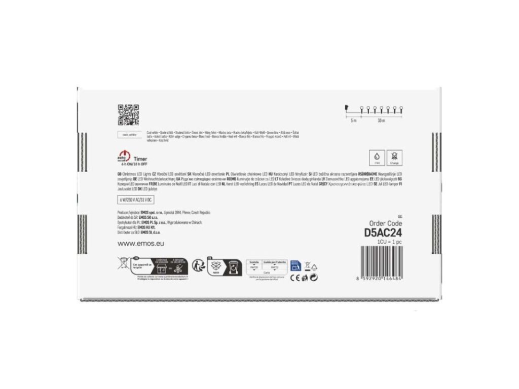 barva drátu: zelená|barva světla: studená bílá|časovač: ano|dálkový ovladač: ne|další funkce: –|délka přívodu: 5 m|funkce: 8 módů (multifunkce)|jazyky aplikace: –|kompatibilita: –|krytí: IP44|LED mezera: 10 cm|materiál: PVC|možnost propojení: ne|notifikace do mobilní aplikace: ne|ovládání hlasovými asistenty: ne|počet LED: 300|podporované OS: –|použití: venkovní i vnitřní|přenosová frekvence: –|příkon: 6 W|prodejní obal: 1 ks, krabice|produkt: řetěz|protokol: –|pro výšku stromu: 250 cm|rozměr: 30 m|tvar: kulička|typ napájení: síťový adaptér|velikost LED: 10 mm|vstupní napětí: 230 V AC|výstupní napětí: 31 V DC|záruční doba: 2 roky|životnost: 10 000 hodinDoplňkové parametry