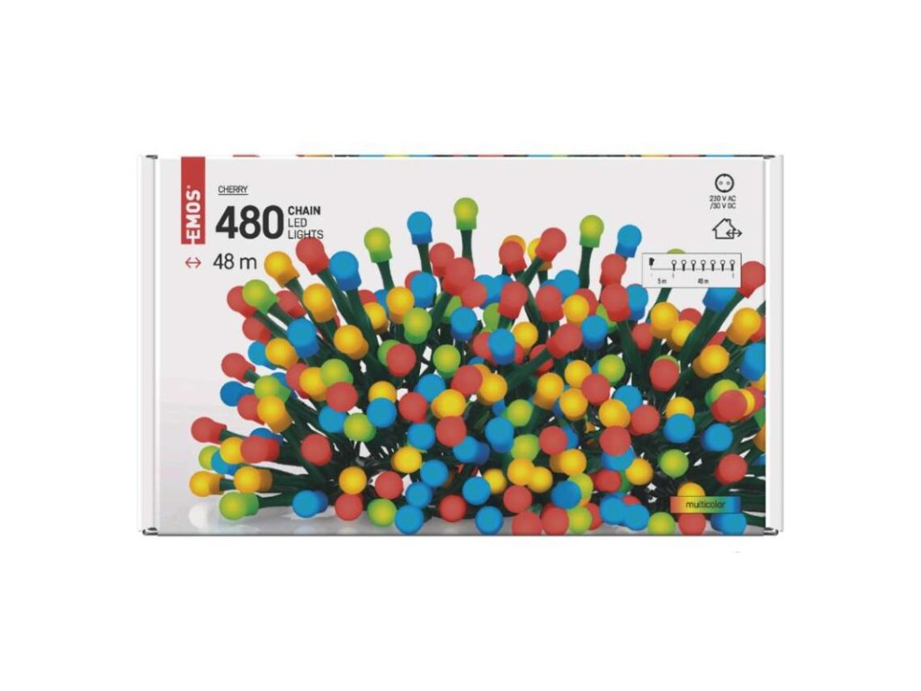 LED vánoční cherry řetěz – kuličky, 48 m, venkovní i vnitřní, multicolor, časovač