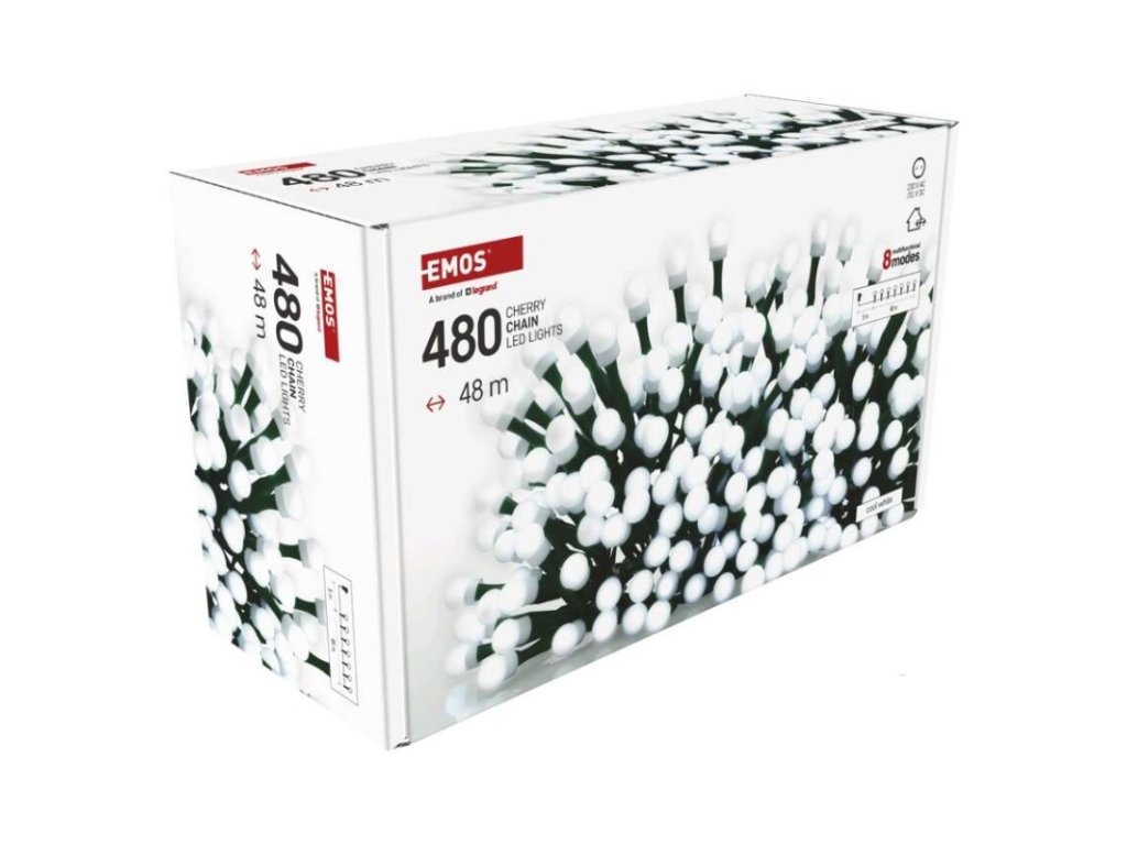 LED vánoční cherry řetěz – kuličky, 48 m, venkovní i vnitřní,studená bílá,programy,časovač