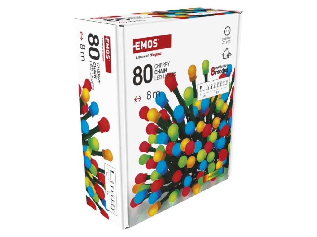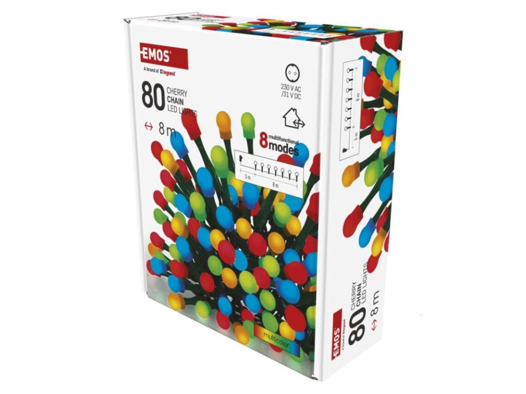 LED vánoční cherry řetěz – kuličky, 8 m, venkovní i vnitřní, multicolor, programy, časovač