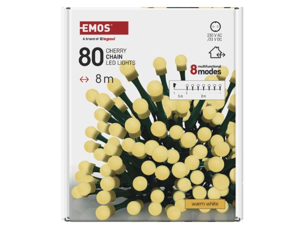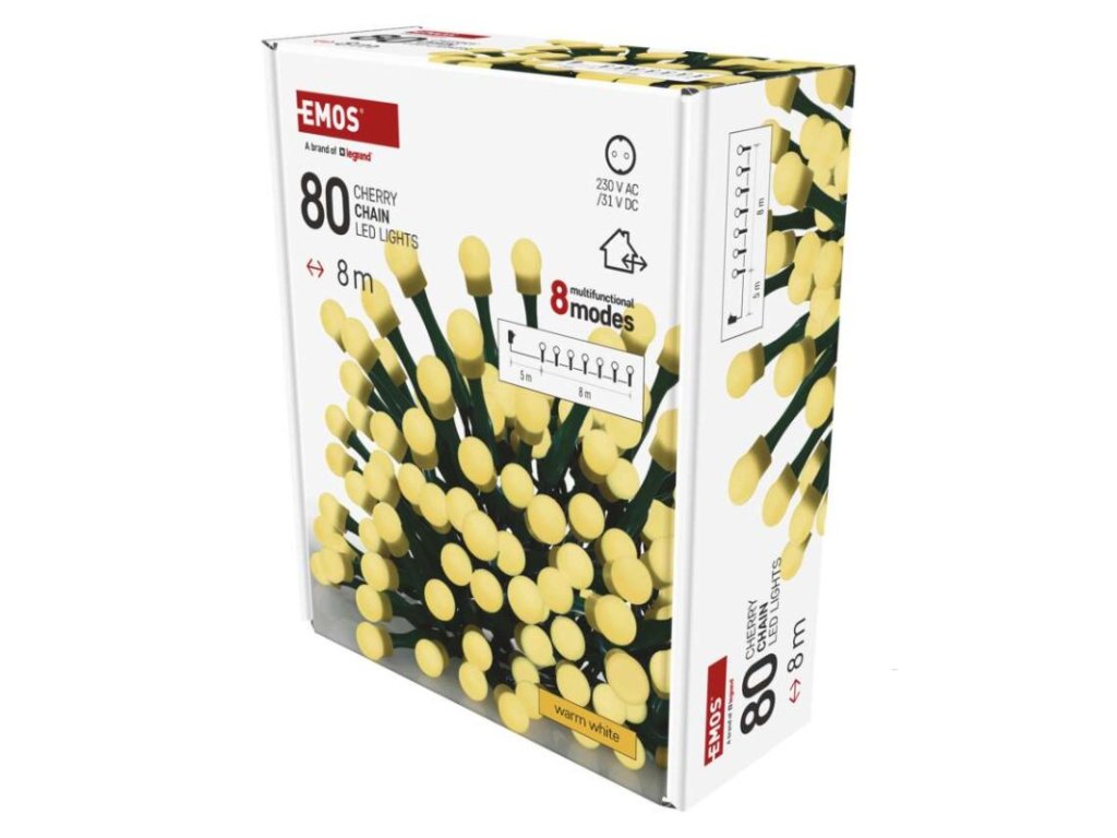 LED vánoční cherry řetěz – kuličky, 8 m, venkovní i vnitřní, teplá bílá, programy, časovač