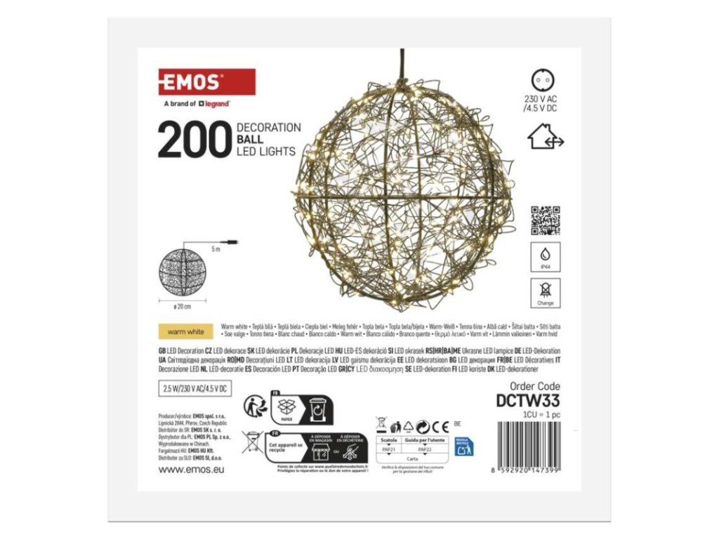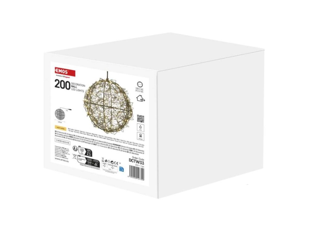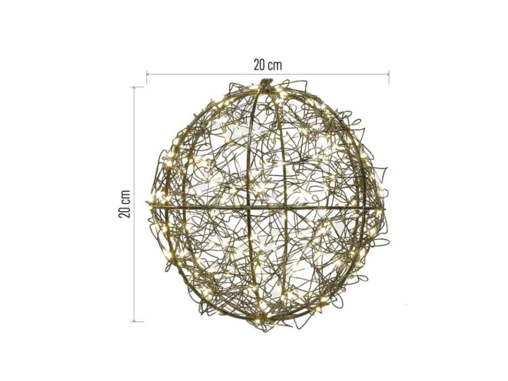 barva drátu: černá|barva světla: teplá bílá|časovač: ne|dálkový ovladač: ne|délka přívodu: 5 m|krytí: IP44|materiál: kov|počet LED: 200|použití: venkovní i vnitřní|příkon: 2,5 W|prodejní obal: 1 ks, krabice|produkt: koule|rozměr: 20 cm|typ napájení: síťový adaptér|vstupní napětí: 230 V AC|výstupní napětí: 4,5 V DC|záruční doba: 2 roky|zdroj svícení: LED|životnost: 10 000 hodinDoplňkové parametry