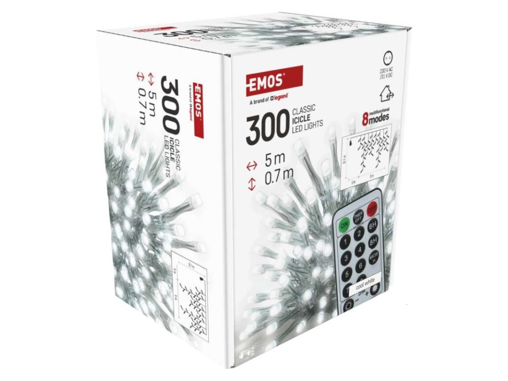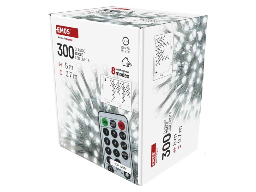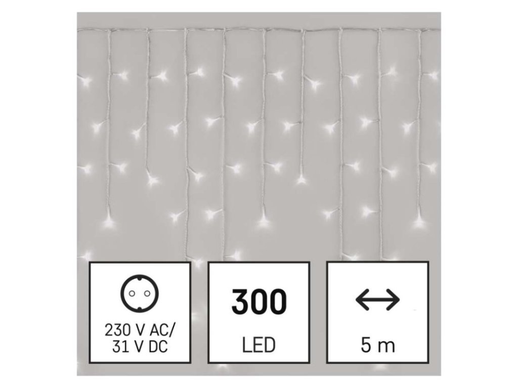 barva drátu: transparentní|barva světla: studená bílá|časovač: ano|dálkový ovladač: ano (1× CR2032, součástí balení)|délka přívodu: 5 m|funkce: 8 módů (multifunkce)|krytí: IP44|LED mezera: 10 cm|materiál: PVC|možnost propojení: ne|počet LED: 300|použití: venkovní i vnitřní|příkon: 6 W|prodejní obal: 1 ks, krabice|produkt: krápníky|pro výšku stromu: neuvádí se|rozměr: 5 × 0,7 m|tvar: klasický|typ napájení: síťový adaptér|velikost LED: 5 mm|vstupní napětí: 230 V AC|výstupní napětí: 31 V DC|záruční doba: 2 roky|životnost: 10 000 hodinDoplňkové parametry
