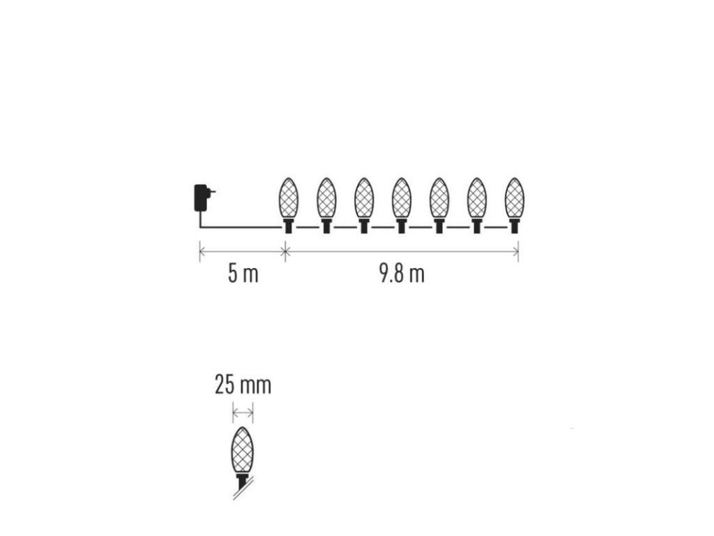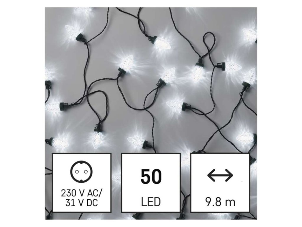 barva drátu: zelená|barva světla: studená bílá|časovač: ne|dálkový ovladač: ne|délka přívodu: 5 m|funkce: 8 módů (multifunkce)|krytí: IP44|LED mezera: neuvádí se|materiál: plast|možnost propojení: ne|počet LED: 50|použití: venkovní i vnitřní|příkon: 3,6 W|prodejní obal: 1 ks, krabice|produkt: řetěz|pro výšku stromu: neuvádí se|rozměr: 9,8 m|tvar: svíčka|typ napájení: síťový adaptér|velikost LED: neuvádí se|vstupní napětí: 230 V AC|výstupní napětí: 31 V DC|záruční doba: 2 roky|životnost: 10 000 hodinDoplňkové parametry