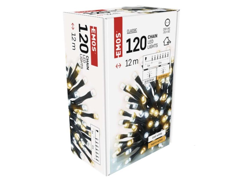 barva drátu: černá|barva světla: studená/teplá bílá|časovač: ano|dálkový ovladač: ne|délka přívodu: 5 m|funkce: svítí|krytí: IP44|LED mezera: 10 cm|materiál: PVC|možnost propojení: ne|počet LED: 120|použití: venkovní i vnitřní|příkon: 3,6 W|prodejní obal: 1 ks, krabice|produkt: řetěz|pro výšku stromu: 170 cm|rozměr: 12 m|tvar: klasický|typ napájení: síťový adaptér|velikost LED: 5 mm|vstupní napětí: 230 V AC|výstupní napětí: 31 V DC|záruční doba: 2 roky|životnost: 10 000 hodinDoplňkové parametry