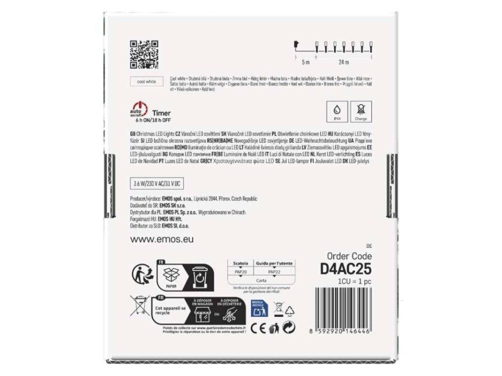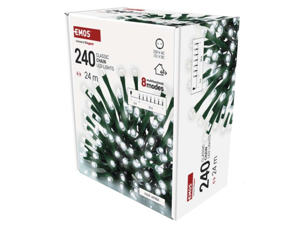 barva drátu: zelená|barva světla: studená bílá|časovač: ano|dálkový ovladač: ne|další funkce: –|délka přívodu: 5 m|funkce: 8 módů (multifunkce)|jazyky aplikace: –|kompatibilita: –|krytí: IP44|LED mezera: 10 cm|materiál: PVC|možnost propojení: ne|notifikace do mobilní aplikace: ne|ovládání hlasovými asistenty: ne|počet LED: 240|podporované OS: –|použití: venkovní i vnitřní|přenosová frekvence: –|příkon: 3,6 W|prodejní obal: 1 ks, krabice|produkt: řetěz|protokol: –|pro výšku stromu: 230 cm|rozměr: 24 m|tvar: klasický|typ napájení: síťový adaptér|velikost LED: 5 mm|vstupní napětí: 230 V AC|výstupní napětí: 31 V DC|záruční doba: 2 roky|životnost: 10 000 hodinDoplňkové parametry