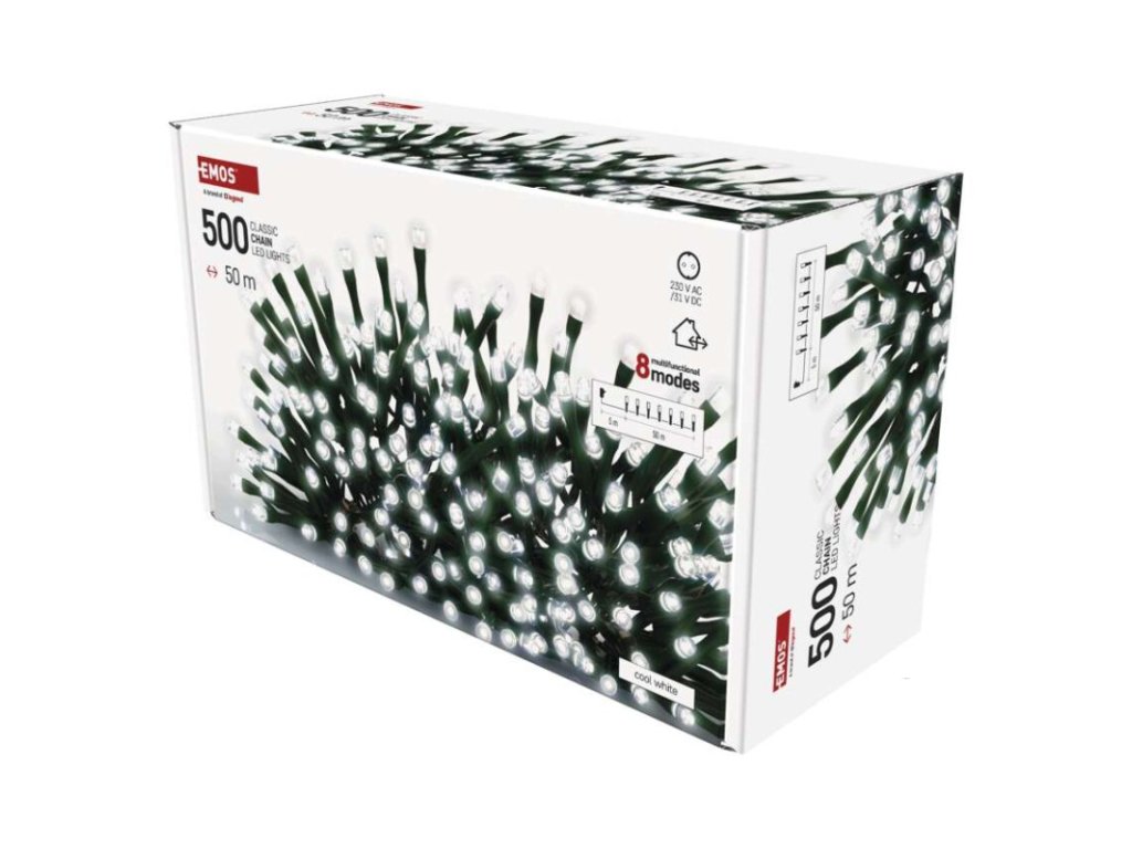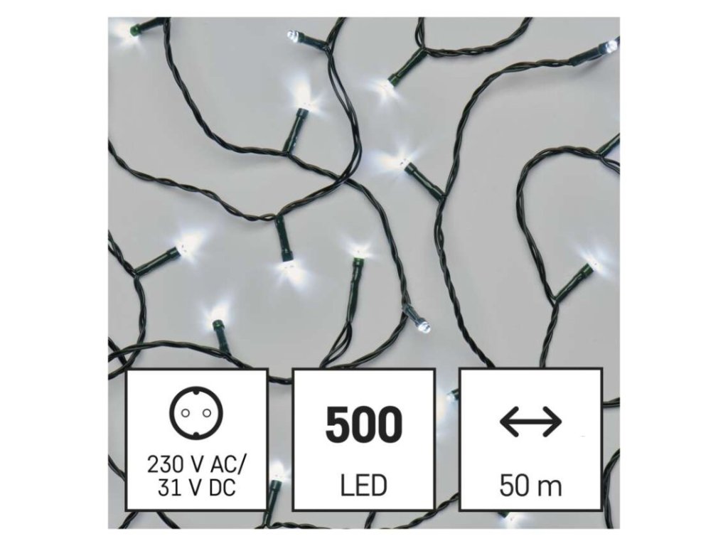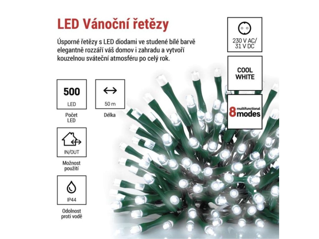 barva drátu: zelená|barva světla: studená bílá|časovač: ano|dálkový ovladač: ne|další funkce: –|délka přívodu: 5 m|funkce: 8 módů (multifunkce)|jazyky aplikace: –|kompatibilita: –|krytí: IP44|LED mezera: 10 cm|materiál: PVC|možnost propojení: ne|notifikace do mobilní aplikace: ne|ovládání hlasovými asistenty: ne|počet LED: 500|podporované OS: –|použití: venkovní i vnitřní|přenosová frekvence: –|příkon: 6 W|prodejní obal: 1 ks, krabice|produkt: řetěz|protokol: –|pro výšku stromu: 300 cm|rozměr: 50 m|tvar: klasický|typ napájení: síťový adaptér|velikost LED: 5 mm|vstupní napětí: 230 V AC|výstupní napětí: 31 V DC|záruční doba: 2 roky|životnost: 10 000 hodinDoplňkové parametry