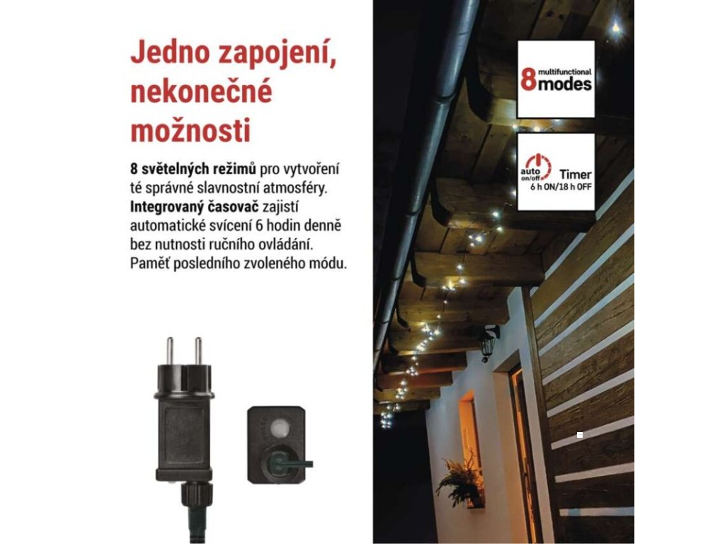 LED vánoční řetěz, 50 m, venkovní i vnitřní, studená bílá, programy, časovač