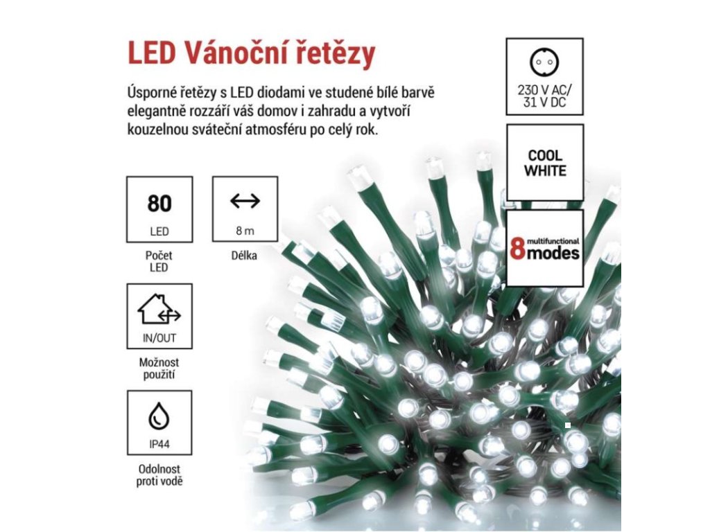LED vánoční řetěz, 8 m, venkovní i vnitřní, studená bílá, programy, časovač