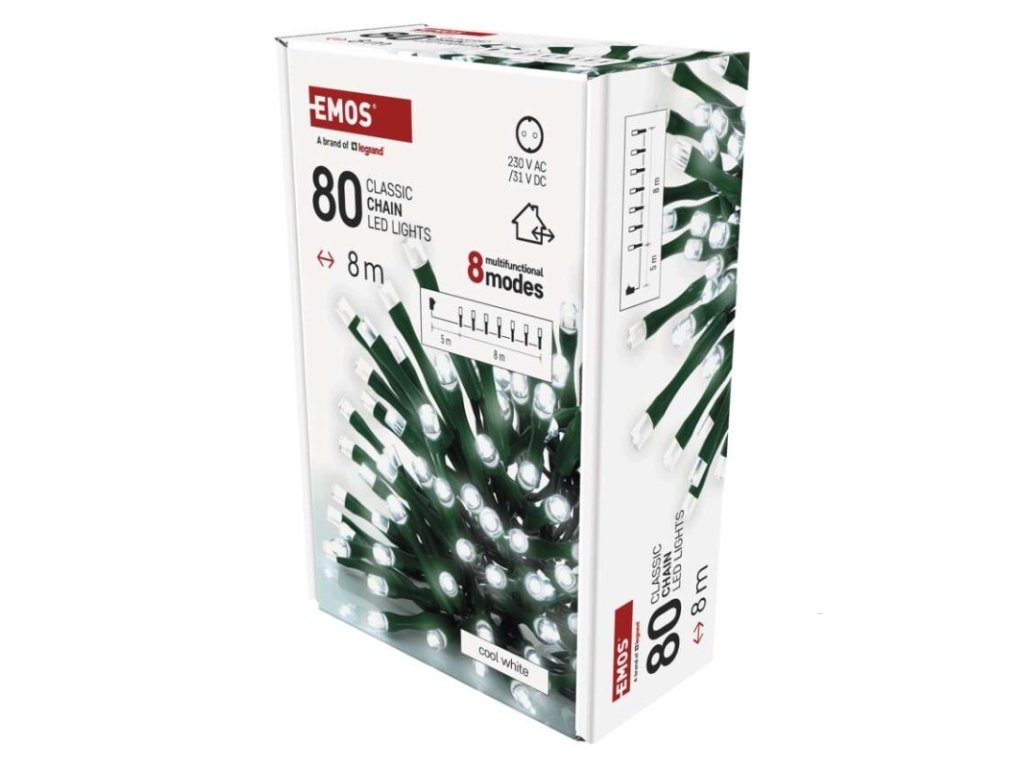 barva drátu: zelená|barva světla: studená bílá|časovač: ano|dálkový ovladač: ne|další funkce: –|délka přívodu: 5 m|funkce: 8 módů (multifunkce)|jazyky aplikace: –|kompatibilita: –|krytí: IP44|LED mezera: 10 cm|materiál: PVC|možnost propojení: ne|notifikace do mobilní aplikace: ne|ovládání hlasovými asistenty: ne|počet LED: 80|podporované OS: –|použití: venkovní i vnitřní|přenosová frekvence: –|příkon: 3,6 W|prodejní obal: 1 ks, krabice|produkt: řetěz|protokol: –|pro výšku stromu: 140 cm|rozměr: 8 m|tvar: klasický|typ napájení: síťový adaptér|velikost LED: 5 mm|vstupní napětí: 230 V AC|výstupní napětí: 31 V DC|záruční doba: 2 roky|životnost: 10 000 hodinDoplňkové parametry