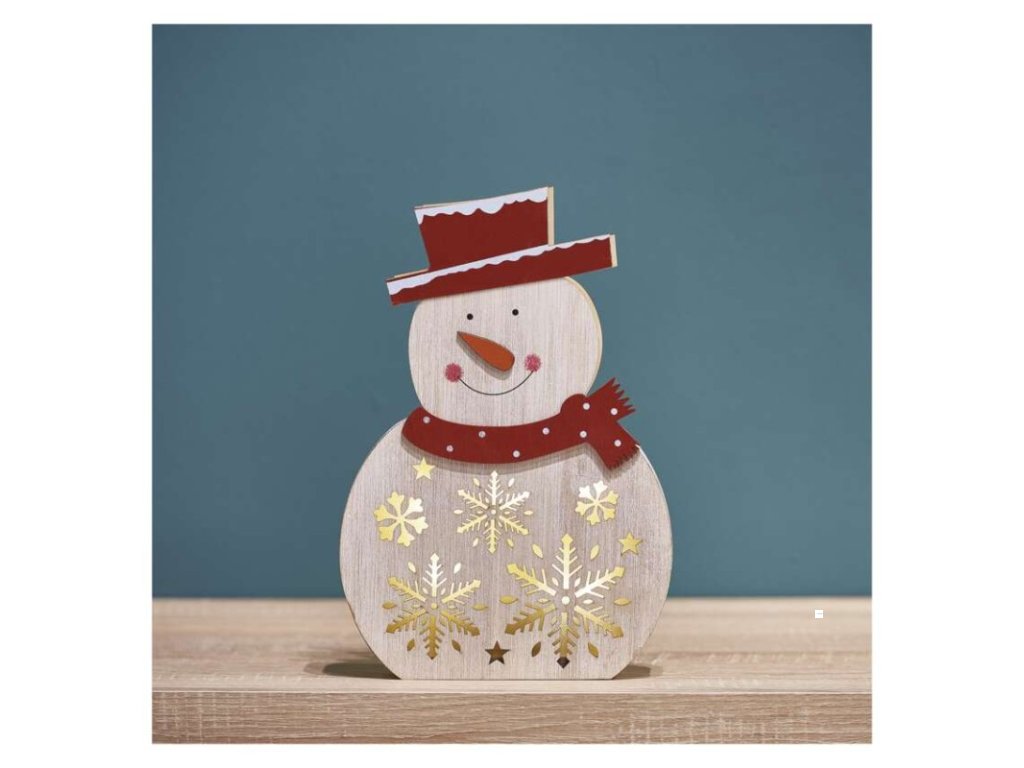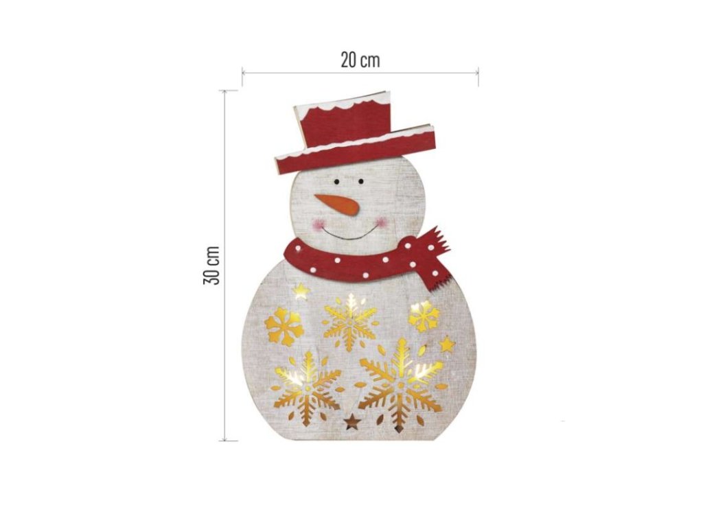barva drátu: neuvádí se|barva světla: teplá bílá|časovač: ano|dálkový ovladač: ne|délka přívodu: neuvádí se|krytí: IP20|materiál: dřevo|počet LED: 5|použití: vnitřní|příkon: 0,3 W|prodejní obal: 1 ks, krabice|produkt: sněhulák|rozměr: 20 × 30 cm|typ napájení: baterie 2× AA (není součástí balení)|vstupní napětí: neuvádí se|výstupní napětí: 3 V DC|záruční doba: 2 roky|zdroj svícení: LED|životnost: 10 000 hodinDoplňkové parametry