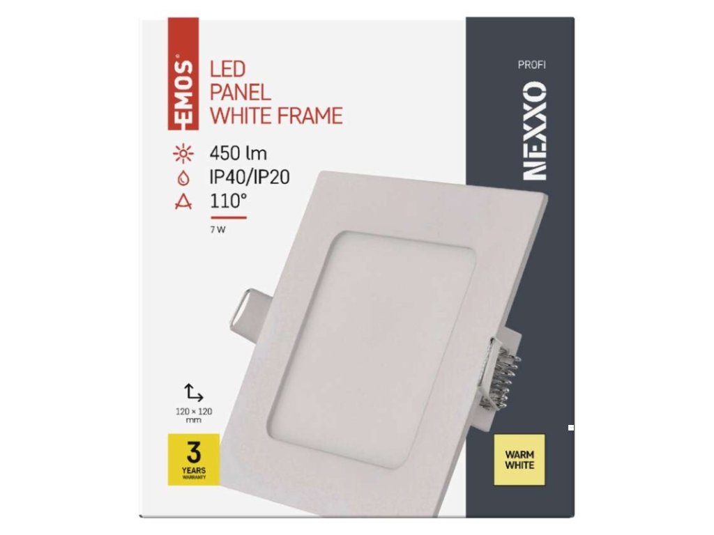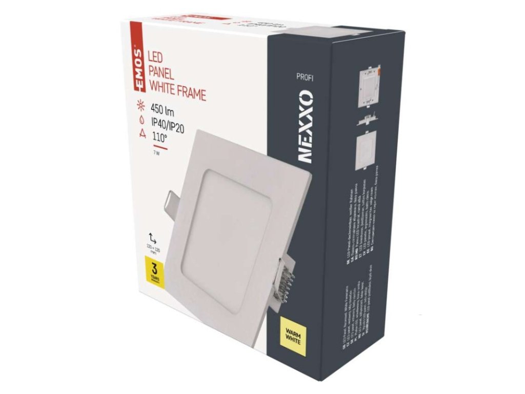 barva světla: teplá bílá|barva těla: bílá|dálkový ovladač: ne|do chodby a na schodiště: ano|do dílny a garáže: ne|do kanceláře: ano|do koupelny: ne|do kuchyně: ano|do obýváku, ložnice a dětského pokoje: ano|dosah senzoru: nemá senzor|flicker-free: ano|frekvence: 50/60 Hz|index podání barev (CRI): Ra > 82|kategorie: PROFI|krytí: IP40/IP20|materiál difuzoru: plast (PS)|materiál LGP: PMMA|materiál těla: hliník|montážní otvor: 105 × 105 mm|možnost stmívání: ne|náhrada za žárovku: 40 W|napětí: 220–240 V|na zahradu a balkon: ne|pohybový senzor: ne|příkon: 7 W|prodejní obal: 1 ks, krabice|proud: 63 mA|řada: NEXXO|rozměr: 120 × 120 × 21 mm|světelná účinnost: 75 lm/W|světelný tok: 450 lm|teplota chromatičnosti: 3 000 K|tvar: čtverec|typ difuzoru: mléčný|typ svítidla: klasické svítidlo|účiník: > 0,5|UGR<: neuvádí se|úhel vyzařování: 110°|umístění: stropní|výstupní proud ze zdroje: 300 mA|záruční doba: 3 roky|zdroj světla: LED|životnost: 30 000 hodin|způsob montáže: vestavnéDoplňkové parametry