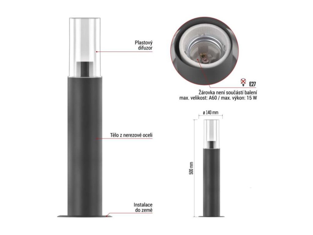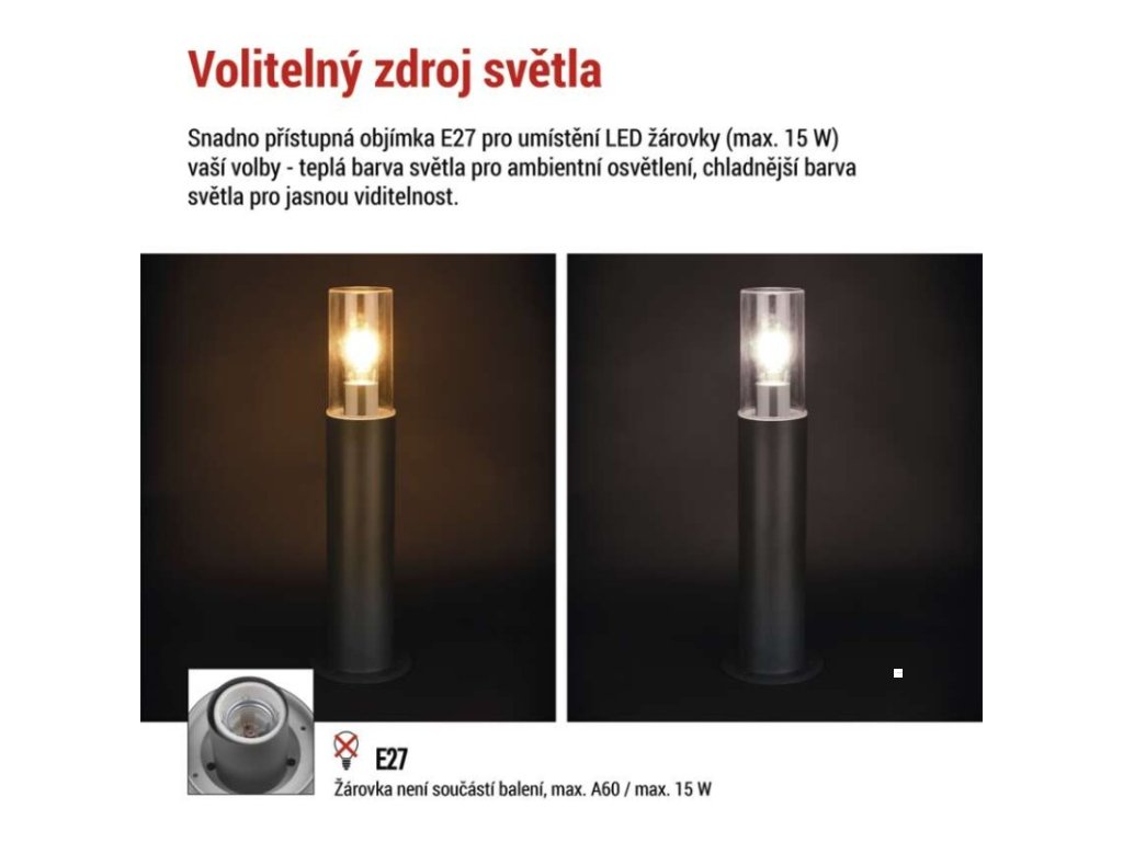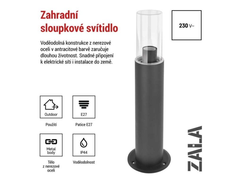 barva: antracit|barva světla: –|dosah PIR senzoru: –|energetická třída použitého světelného zdroje: –|fotovoltaický článek: ne|frekvence: 50/60 Hz|index podání barev (CRI): –|kategorie: CLASSIC|krytí: IP44|materiál: nerezová ocel|materiál difuzoru: plast|napájení: 230 V AC|napětí: 220-240 V~|patice (uchycení žárovky): E27|PIR senzor: ne|příkon: –|prodejní obal: 1 ks, krabička|řada: ZALA|rozměr: 140 × 140 × 500 mm|rozsah pracovní teploty: -20 ~ +40 °C|soumrakový spínač: ne|světelný tok: –|teplota chromatičnosti: –|vestavěný vypínač: ne|žárovka součástí balení: ne|zdroj světla: –|životnost: –Doplňkové parametry