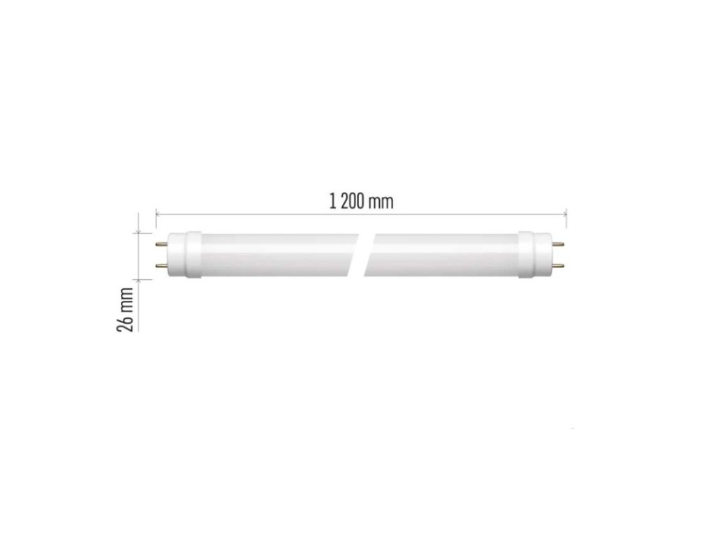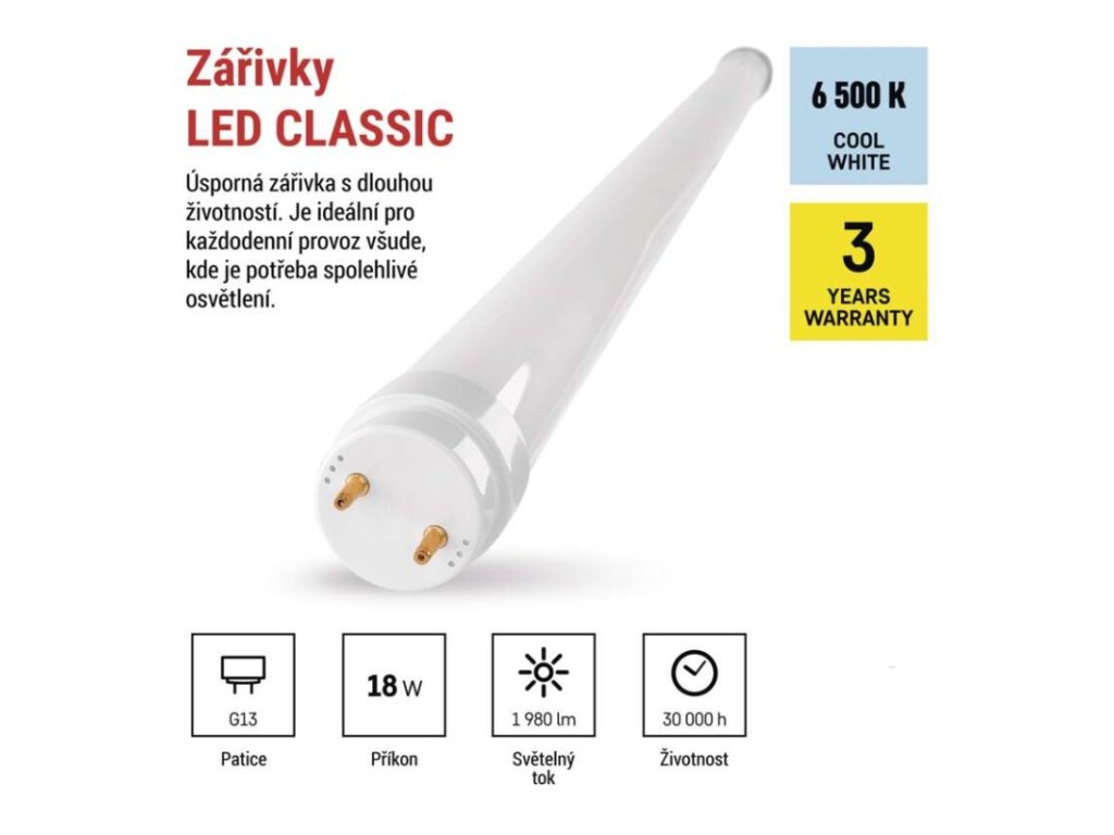barva světla: studená bílá|energetická třída: E|index podání barev (CRI): 80|kompatibilita: –|náhrada za žárovku: neuvádí se|napětí: 230 V~/50 Hz|notifikace do mobilní aplikace: –|ovládání hlasovými asistenty: –|patice (uchycení žárovky): G13|počet čipů: neuvádí se|počet spínacích cyklů: 20 000|podporované OS: –|přenosová frekvence: –|příkon: 18 W|prodejní obal: 25 ks, krabička|protokol: –|řada: CLASSIC|rozměr: 1 200 × 26 × 26 mm|stmívatelná: ne|světelná účinnost: 110 lm/W|světelný tok: 1 980 lm|technologie: LED|teplota chromatičnosti: 6 500 K|tvar: T8|typ čipů: SMD|účiník: 0,5|úhel vyzařování: 260°|záruční doba: 3 roky|životnost: 30 000 hodinDoplňkové parametry