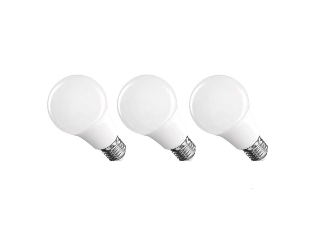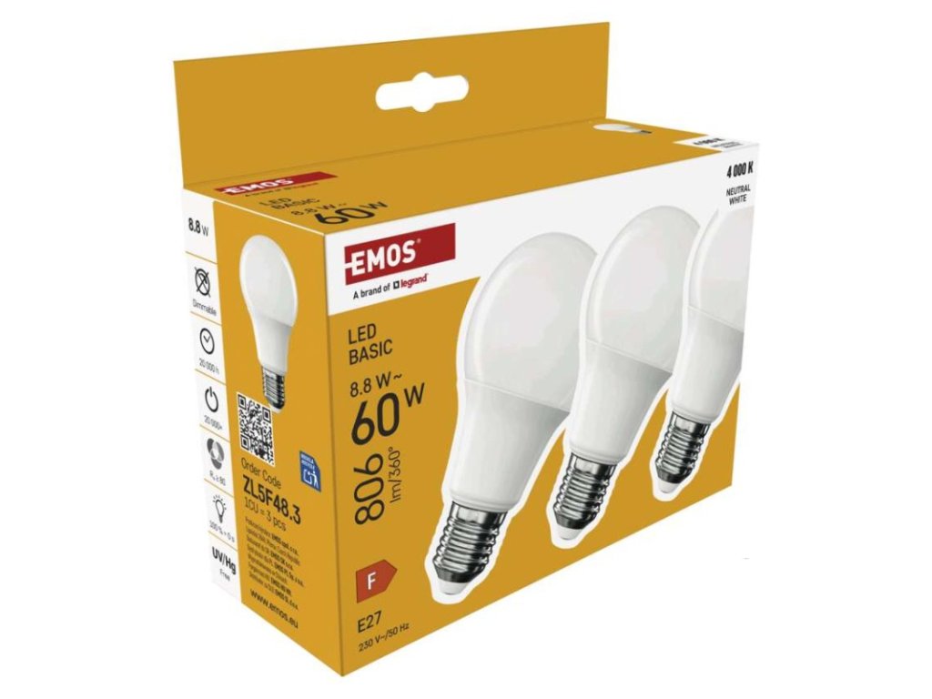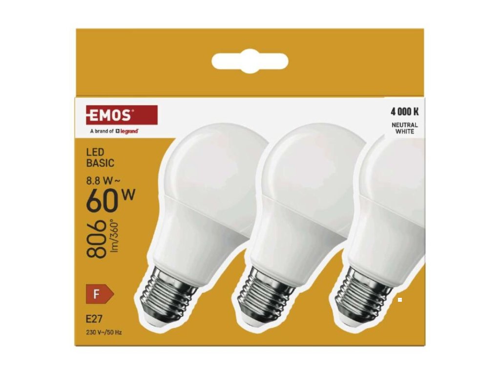 barva světla: neutrální bílá|energetická třída: F|index podání barev (CRI): 80|kompatibilita: –|náhrada za žárovku: 60 W|napětí: 230 V~/50 Hz|notifikace do mobilní aplikace: ne|ovládání hlasovými asistenty: ne|patice (uchycení žárovky): E27|počet čipů: neuvádí se|počet spínacích cyklů: 20 000|podporované OS: –|přenosová frekvence: –|příkon: 8,8 W|prodejní obal: 3 ks, krabička|protokol: –|řada: BASIC|rozměr: 60 × 60 × 110 (max.) mm|stmívatelná: ne|světelná účinnost: 92 lm/W|světelný tok: 806 lm|technologie: LED|teplota chromatičnosti: 4 000 K|tvar: A60|typ čipů: SMD|účiník: 0,50|úhel vyzařování: 200°|záruční doba: 2 roky|životnost: 20 000 hodinDoplňkové parametry