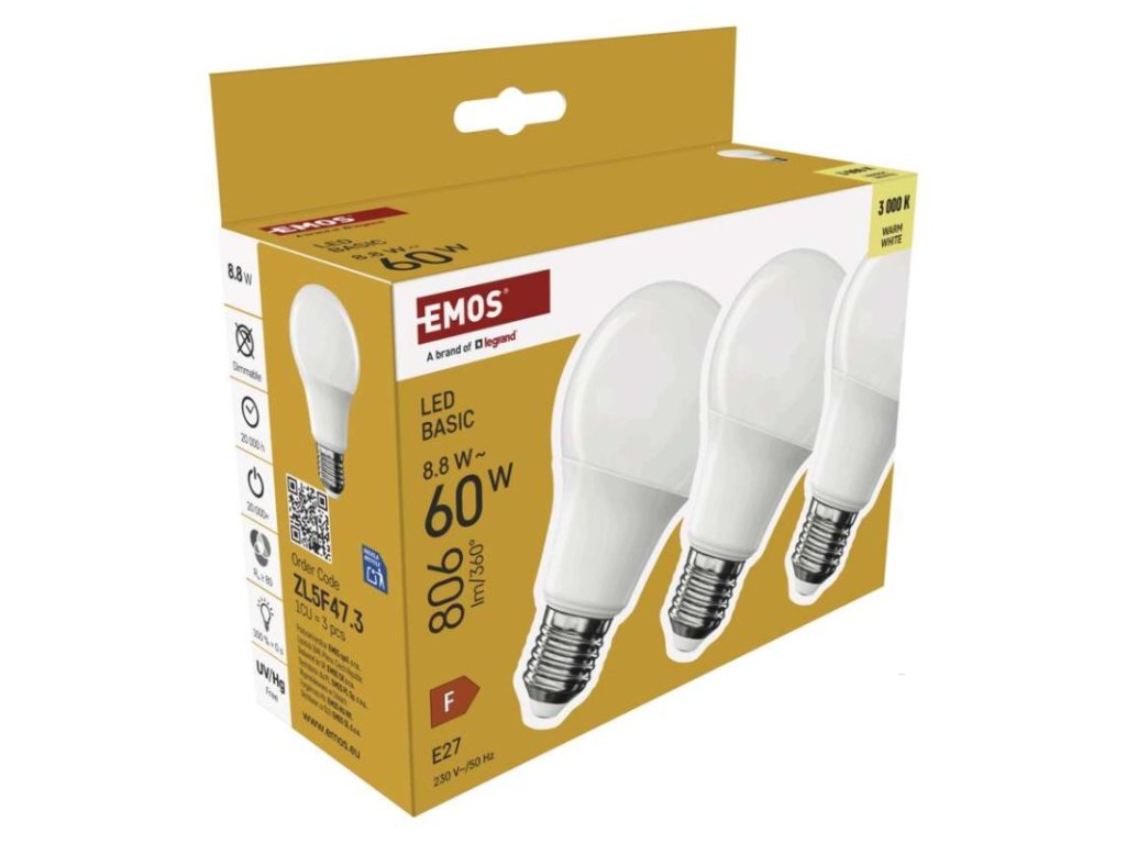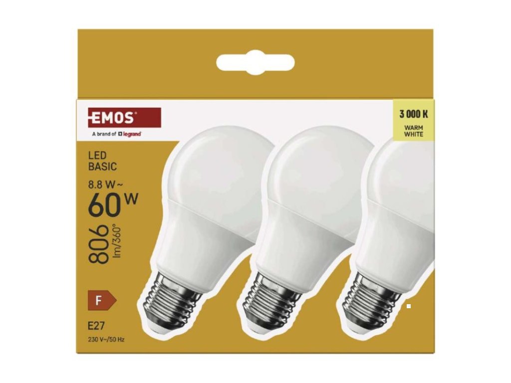 barva světla: teplá bílá|energetická třída: F|index podání barev (CRI): 80|kompatibilita: –|náhrada za žárovku: 60 W|napětí: 230 V~/50 Hz|notifikace do mobilní aplikace: ne|ovládání hlasovými asistenty: ne|patice (uchycení žárovky): E27|počet čipů: neuvádí se|počet spínacích cyklů: 20 000|podporované OS: –|přenosová frekvence: –|příkon: 8,8 W|prodejní obal: 3 ks, krabička|protokol: –|řada: BASIC|rozměr: 60 × 60 × 110 (max.) mm|stmívatelná: ne|světelná účinnost: 92 lm/W|světelný tok: 806 lm|technologie: LED|teplota chromatičnosti: 3 000 K|tvar: A60|typ čipů: SMD|účiník: 0,50|úhel vyzařování: 200°|záruční doba: 2 roky|životnost: 20 000 hodinDoplňkové parametry