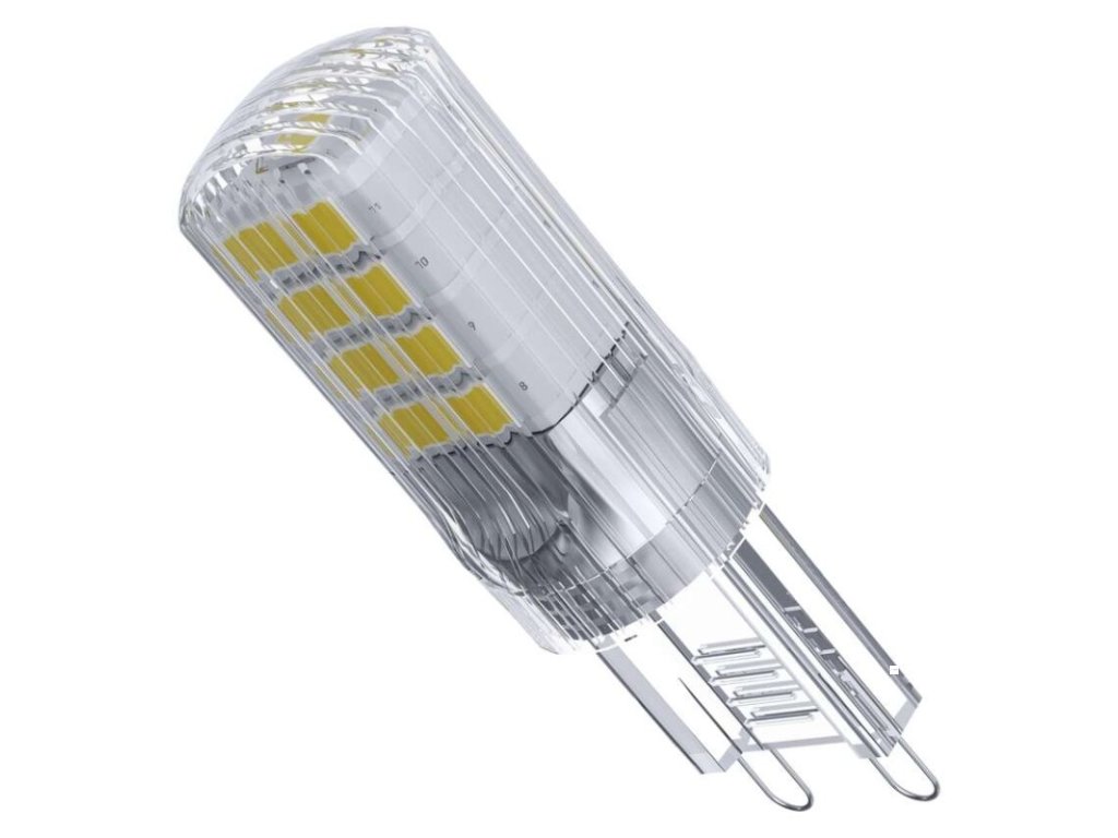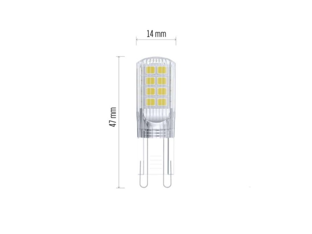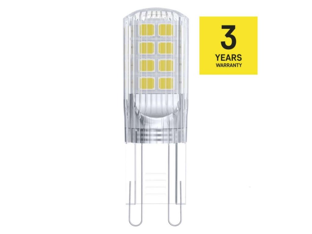 barva světla: teplá bílá|energetická třída: D|index podání barev (CRI): 80|kompatibilita: –|náhrada za žárovku: 32 W|napětí: 230 V~/50 Hz|notifikace do mobilní aplikace: –|ovládání hlasovými asistenty: –|patice (uchycení žárovky): G9|počet čipů: 18|počet spínacích cyklů: 25 000|podporované OS: –|přenosová frekvence: –|příkon: 2,5 W|prodejní obal: 1 ks, krabička|protokol: –|řada: CLASSIC|rozměr: 47 × 14 × 14 mm|stmívatelná: ne|světelná účinnost: 140 lm/W|světelný tok: 350 lm|technologie: LED|teplota chromatičnosti: 3 000 K|tvar: JC|typ čipů: SMD|účiník: 0,59|úhel vyzařování: 320°|záruční doba: 3 roky|životnost: 30 000 hodinDoplňkové parametry