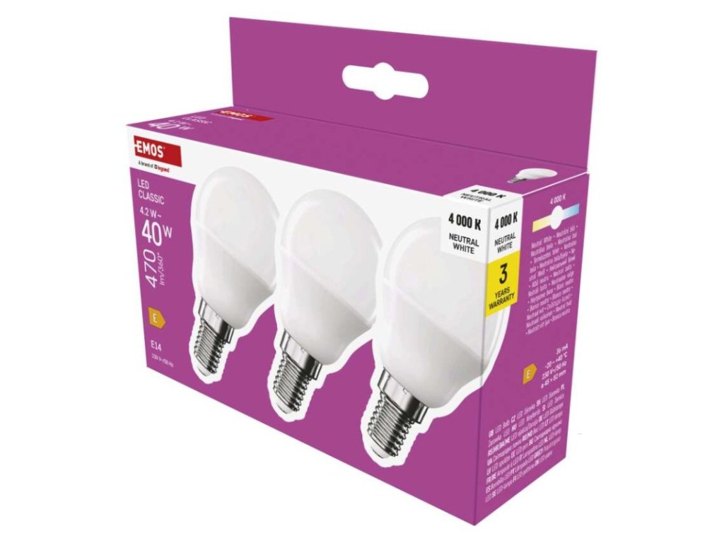 barva světla: neutrální bílá|energetická třída: E|index podání barev (CRI): 80|kompatibilita: –|náhrada za žárovku: 40 W|napětí: 230 V~/50 Hz|notifikace do mobilní aplikace: ne|ovládání hlasovými asistenty: ne|patice (uchycení žárovky): E14|počet čipů: neuvádí se|počet spínacích cyklů: 30 000|podporované OS: –|přenosová frekvence: –|příkon: 4,2 W|prodejní obal: 3 ks, krabička|protokol: –|řada: CLASSIC|rozměr: 45 × 45 × 82 mm|stmívatelná: ne|světelná účinnost: 112 lm/W|světelný tok: 470 lm|technologie: LED|teplota chromatičnosti: 4 000 K|tvar: Mini Globe|typ čipů: SMD|účiník: 0,50|úhel vyzařování: 150°|záruční doba: 3 roky|životnost: 30 000 hodinDoplňkové parametry