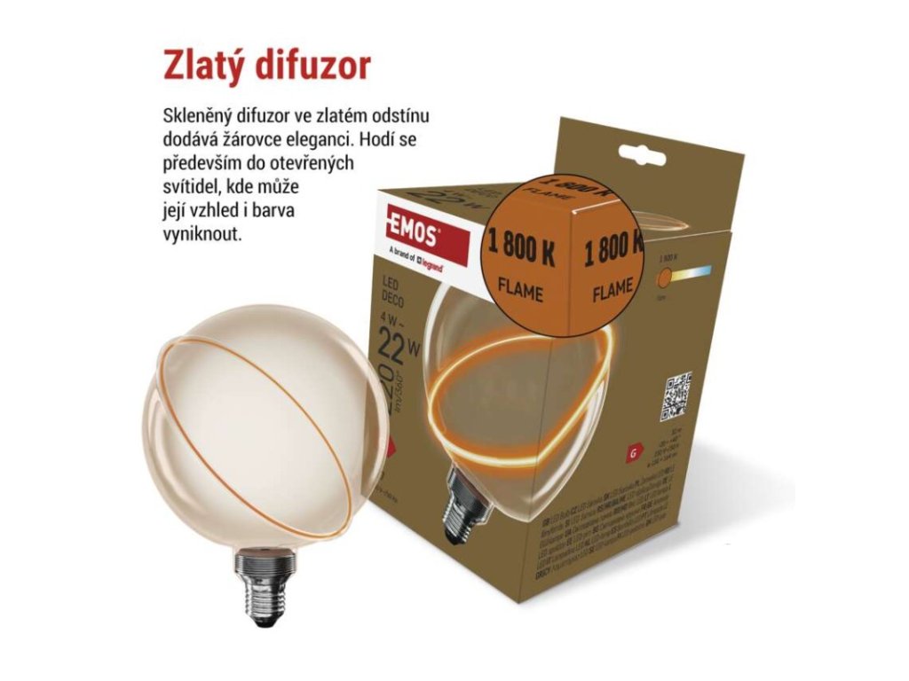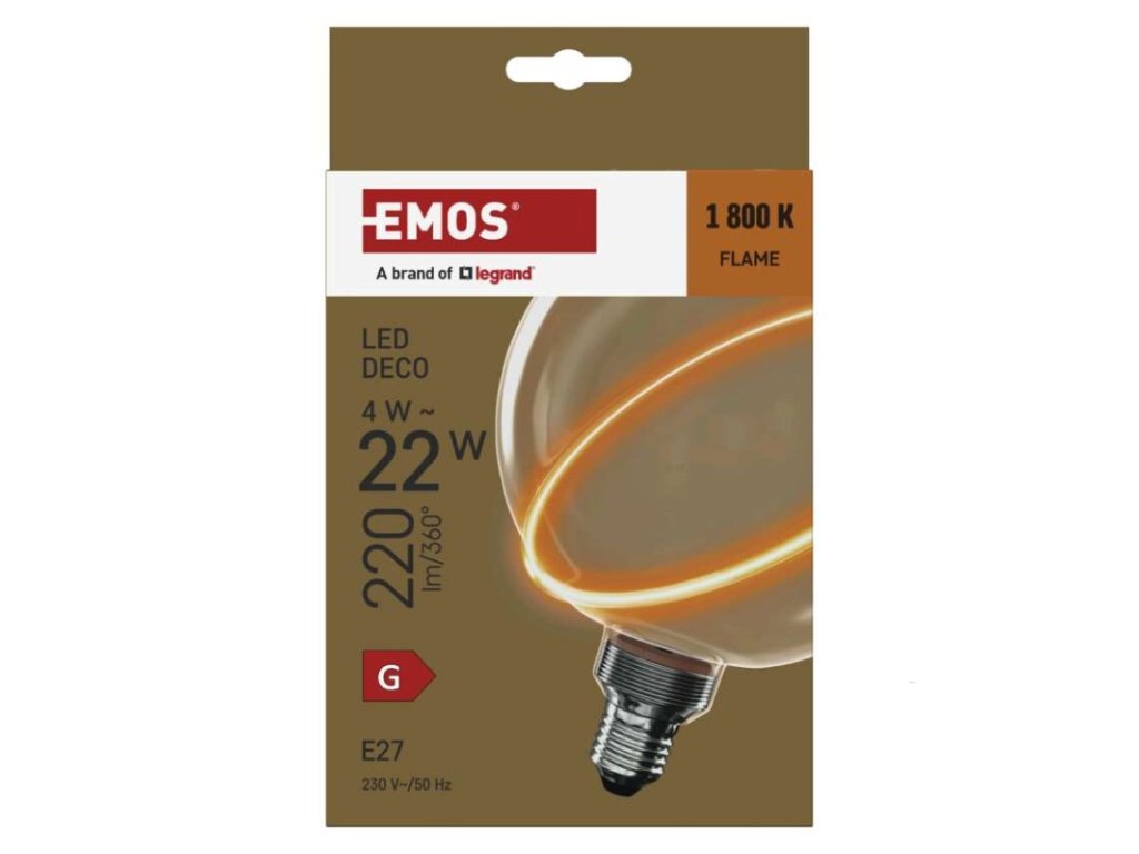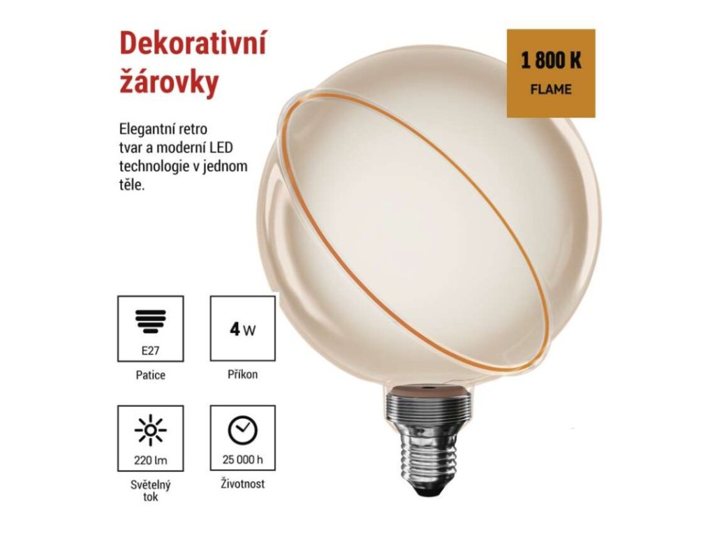 barva světla: Flame|energetická třída: G|index podání barev (CRI): 80|kompatibilita: neuvádí se|náhrada za žárovku: 22 W|napětí: 230 V~/50 Hz|notifikace do mobilní aplikace: neuvádí se|ovládání hlasovými asistenty: neuvádí se|patice (uchycení žárovky): E27|počet čipů: neuvádí se|počet spínacích cyklů: 25 000|podporované OS: neuvádí se|přenosová frekvence: neuvádí se|příkon: 4 W|prodejní obal: 1 ks, krabička|protokol: neuvádí se|řada: DECO|rozměr: 130 × 130 × 164 mm|stmívatelná: ne|světelná účinnost: 55 lm/W|světelný tok: 220 lm|technologie: LED|teplota chromatičnosti: 1 800 K|tvar: G130SRA|typ čipů: COB|účiník: 0,40|úhel vyzařování: 330°|záruční doba: 2 roky|životnost: 25 000 hodinDoplňkové parametry