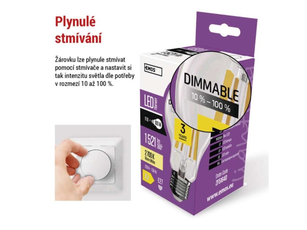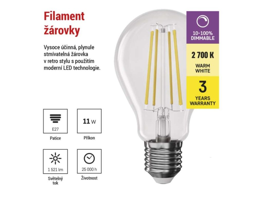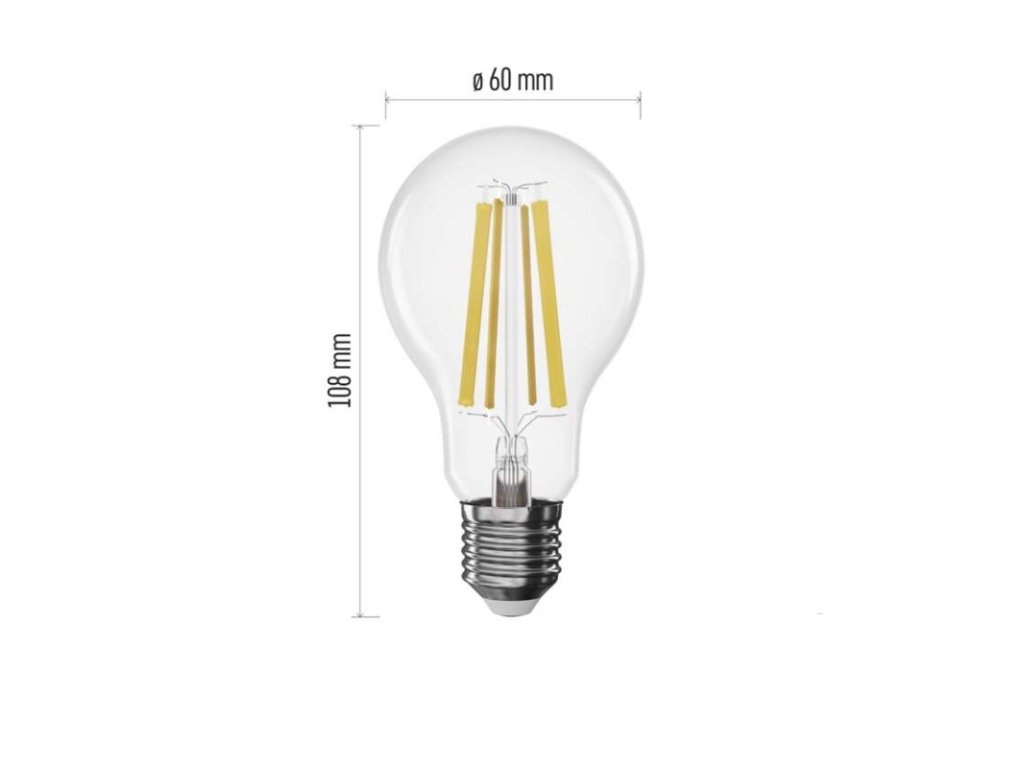barva světla: teplá bílá|energetická třída: D|index podání barev (CRI): 80|kompatibilita: –|náhrada za žárovku: 100 W|napětí: 230 V~/50 Hz|notifikace do mobilní aplikace: –|ovládání hlasovými asistenty: –|patice (uchycení žárovky): E27|počet čipů: neuvádí se|počet spínacích cyklů: 25 000|podporované OS: –|přenosová frekvence: –|příkon: 11 W|prodejní obal: 1 ks, krabička|protokol: –|řada: FILAMENT|rozměr: 60 × 60 × 108 mm|stmívatelná: ano|světelná účinnost: 138 lm/W|světelný tok: 1 521 lm|technologie: LED|teplota chromatičnosti: 2 700 K|tvar: A60|typ čipů: COB|účiník: 0,94|úhel vyzařování: 320°|záruční doba: 3 roky|životnost: 25 000 hodinDoplňkové parametry