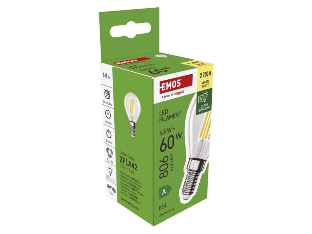 barva světla: teplá bílá|energetická třída: A|index podání barev (CRI): 80|kompatibilita: neuvádí se|náhrada za žárovku: 60 W|napětí: 230 V~/50 Hz|notifikace do mobilní aplikace: neuvádí se|ovládání hlasovými asistenty: neuvádí se|patice (uchycení žárovky): E14|počet čipů: 4|počet spínacích cyklů: 30 000|podporované OS: neuvádí se|přenosová frekvence: neuvádí se|příkon: 3,8 W|prodejní obal: 1 ks, krabička|protokol: neuvádí se|řada: FILAMENT|rozměr: 45 × 45 × 80 mm|stmívatelná: ne|světelná účinnost: 212 lm/W|světelný tok: 806 lm|technologie: LED|teplota chromatičnosti: 2 700 K|tvar: Mini Globe|typ čipů: COB|účiník: 0,5|úhel vyzařování: 360°|záruční doba: 5 let|životnost: 50 000 hodinDoplňkové parametry