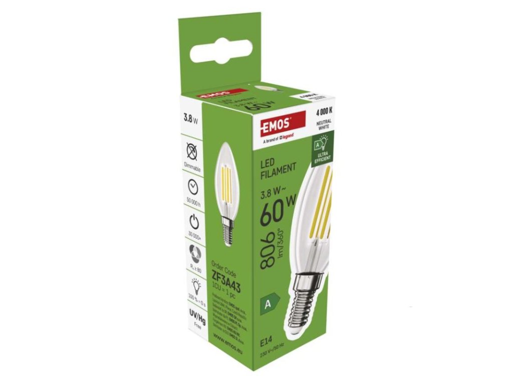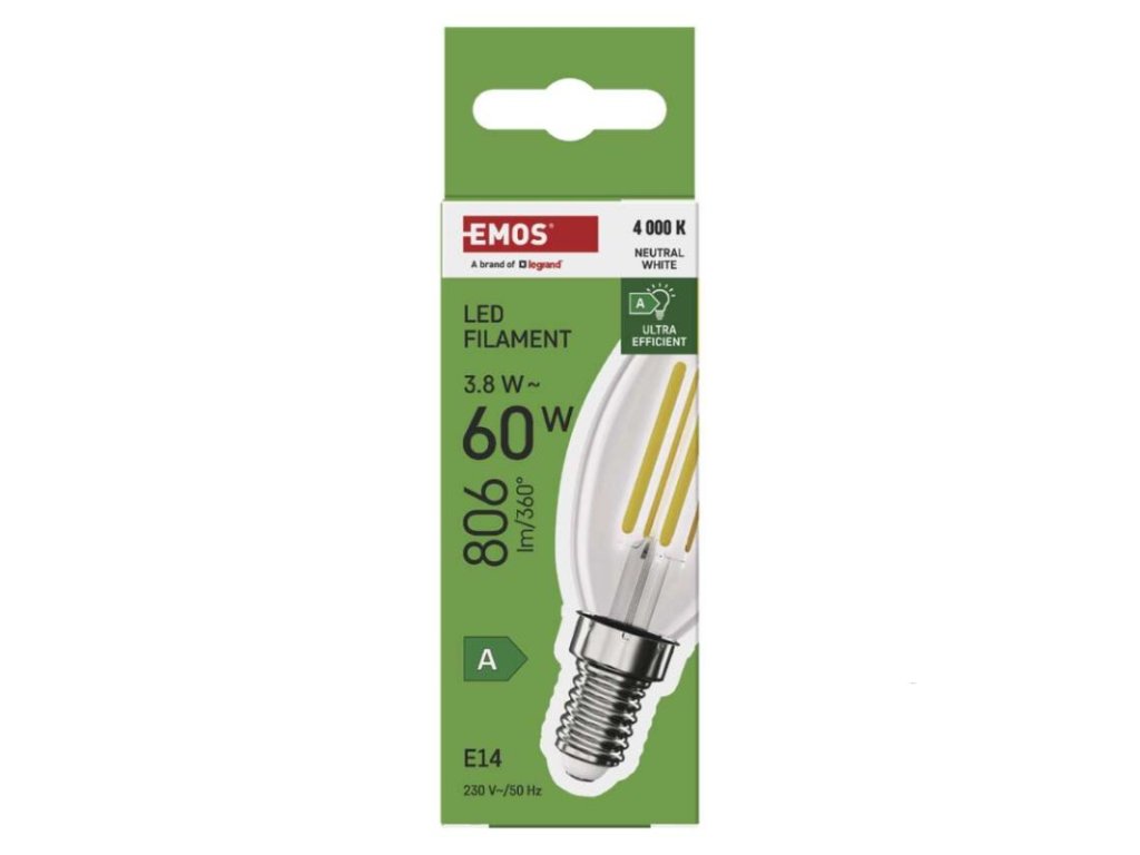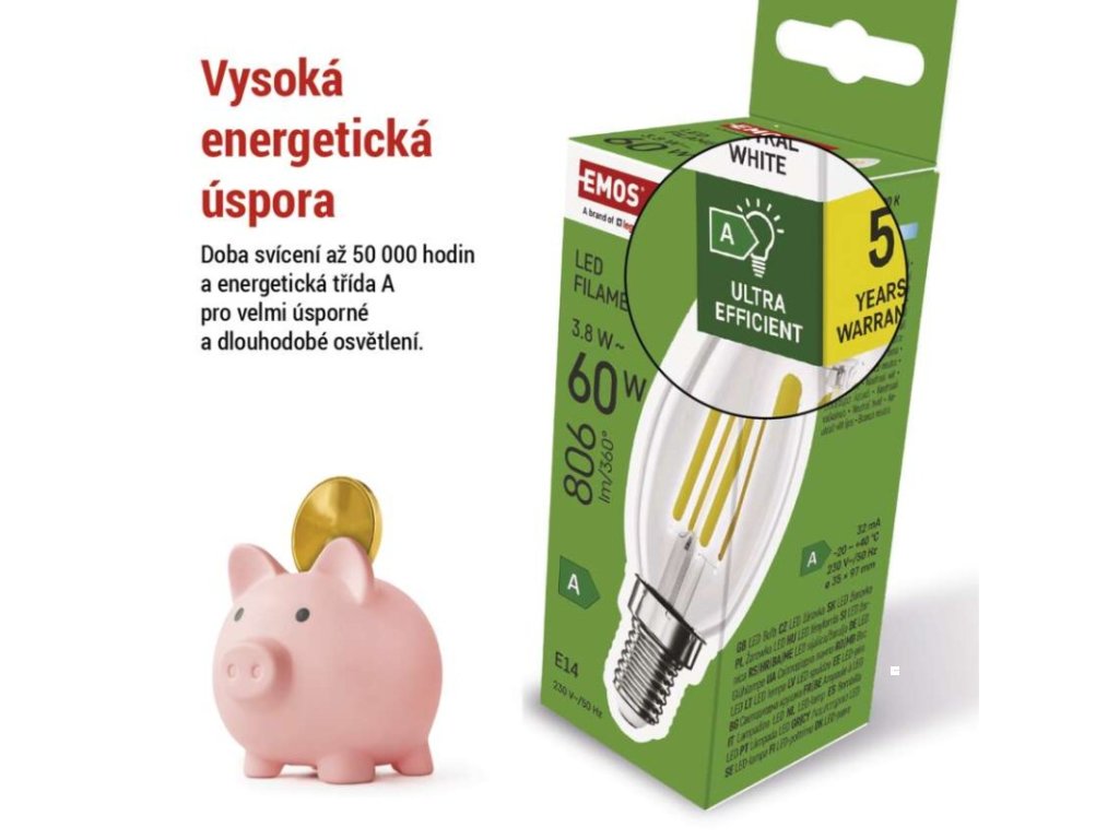 barva světla: neutrální bílá|energetická třída: A|index podání barev (CRI): 80|kompatibilita: neuvádí se|náhrada za žárovku: 60 W|napětí: 230 V~/50 Hz|notifikace do mobilní aplikace: neuvádí se|ovládání hlasovými asistenty: neuvádí se|patice (uchycení žárovky): E14|počet čipů: 4|počet spínacích cyklů: 30 000|podporované OS: neuvádí se|přenosová frekvence: neuvádí se|příkon: 3,8 W|prodejní obal: 1 ks, krabička|protokol: neuvádí se|řada: FILAMENT|rozměr: 35 × 35 × 97 mm|stmívatelná: ne|světelná účinnost: 212 lm/W|světelný tok: 806 lm|technologie: LED|teplota chromatičnosti: 4 000 K|tvar: svíčka|typ čipů: COB|účiník: 0,5|úhel vyzařování: 360°|záruční doba: 5 let|životnost: 50 000 hodinDoplňkové parametry