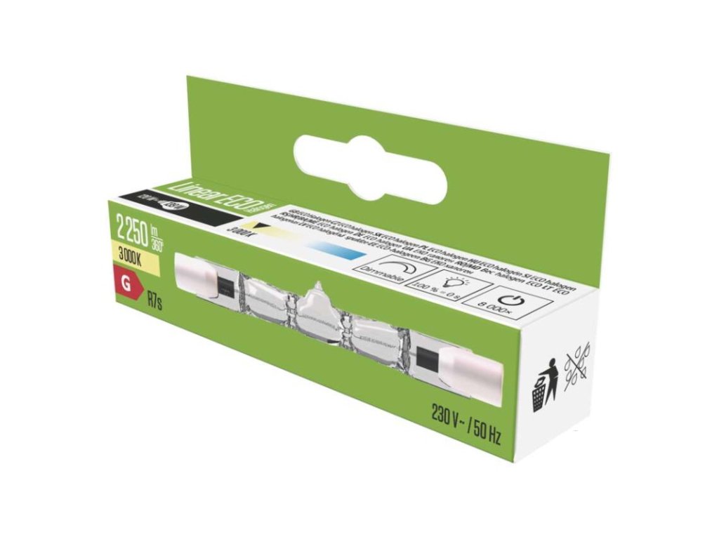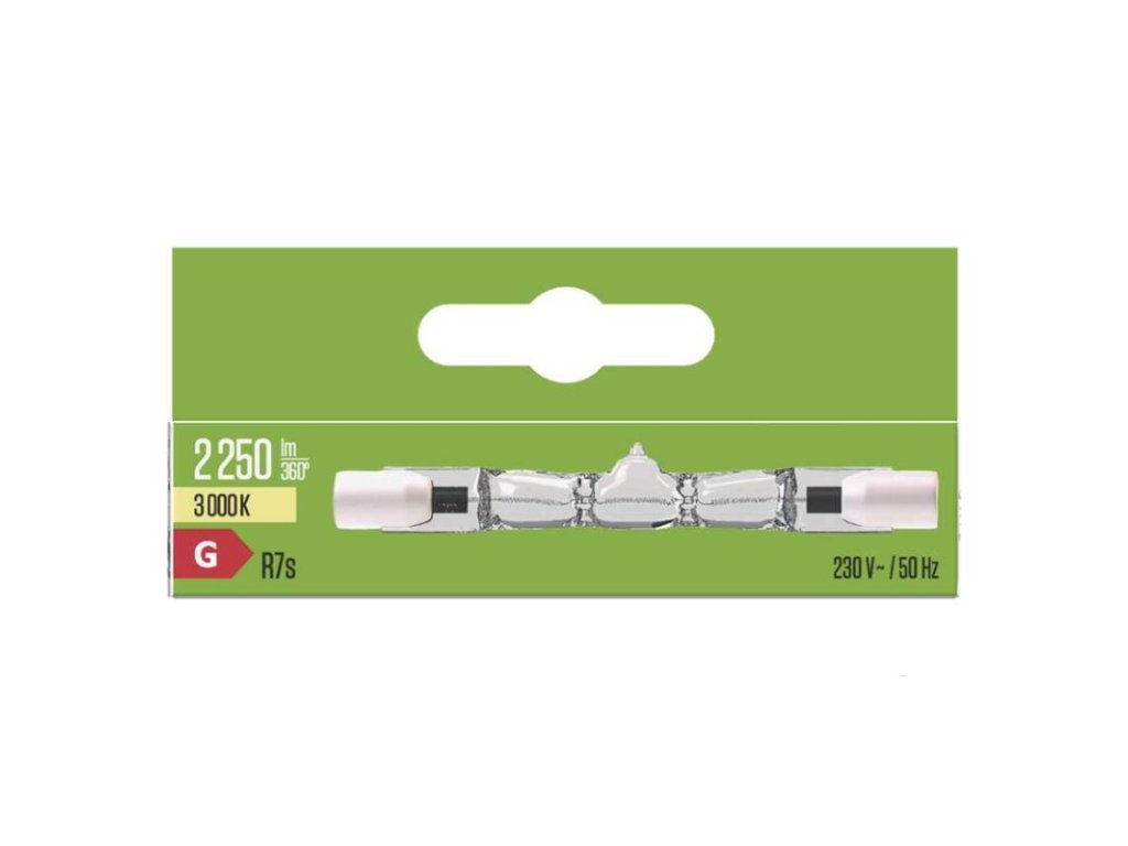 barva světla: teplá bílá|energetická třída: G|index podání barev (CRI): 99|kompatibilita: –|náhrada za žárovku: 139 W|napětí: 230 V~/50 Hz|notifikace do mobilní aplikace: –|ovládání hlasovými asistenty: –|patice (uchycení žárovky): R7s|počet čipů: neuvádí se|počet spínacích cyklů: 8 000|podporované OS: –|přenosová frekvence: –|příkon: 120 W|prodejní obal: 1 ks, krabička|protokol: –|řada: HALOGEN|rozměr: 8 × 78 × 8 mm|stmívatelná: ano|světelná účinnost: 19 lm/W|světelný tok: 2 250 lm|technologie: ECO halogen|teplota chromatičnosti: 3 000 K|tvar: J78|typ čipů: neuvádí se|účiník: neuvádí se|úhel vyzařování: 360°|záruční doba: 2 roky|životnost: 4 000 hodinDoplňkové parametry