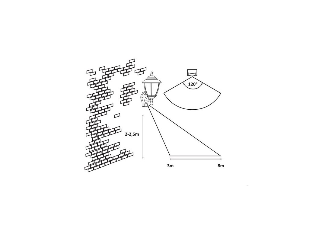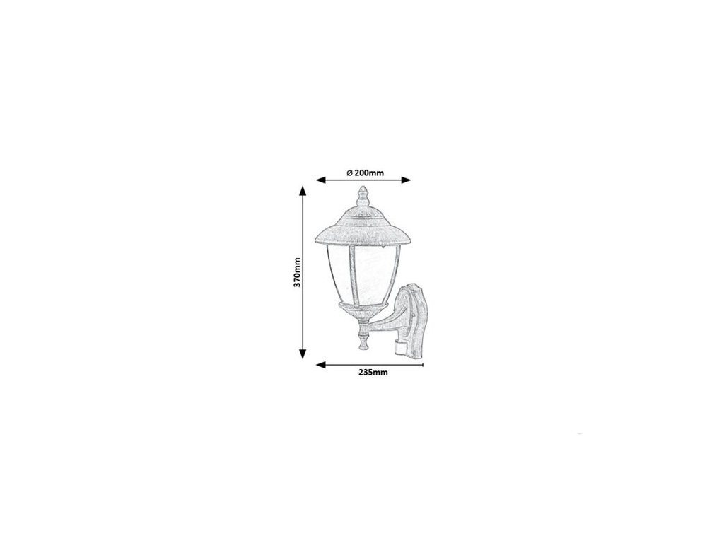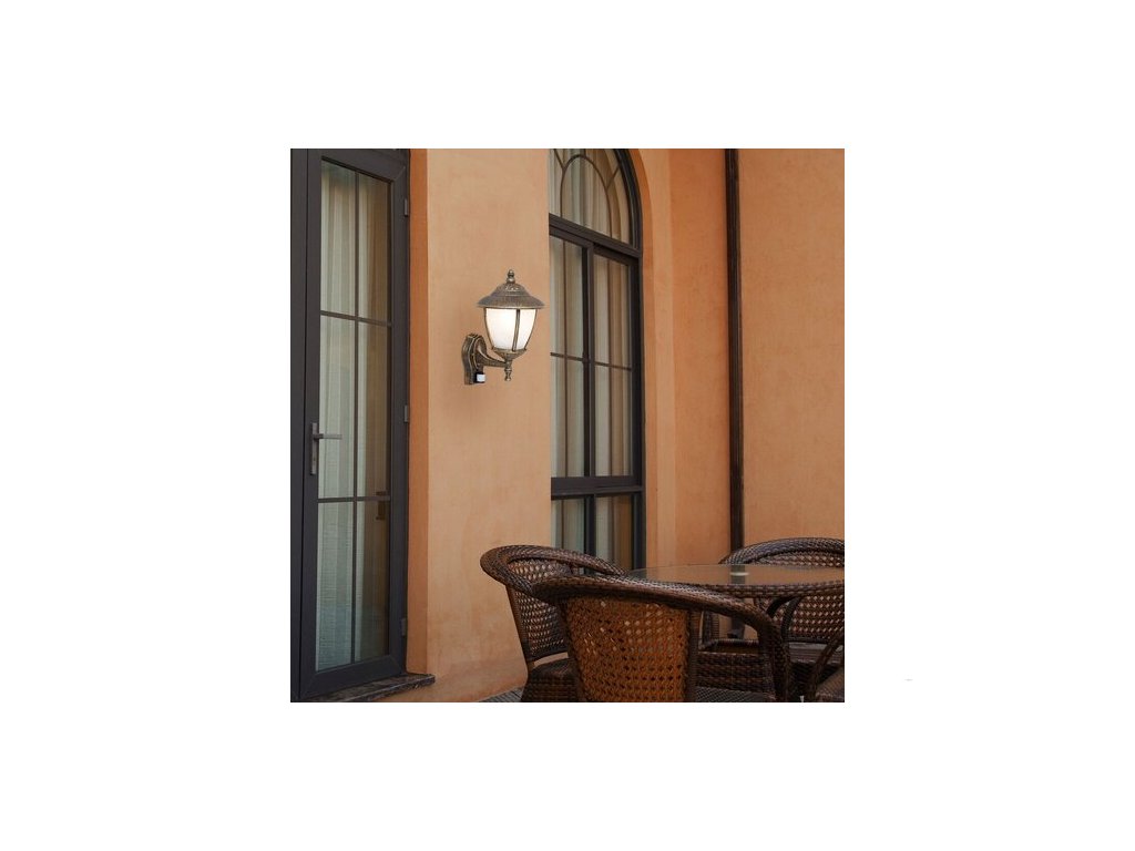 Venkovní nástěnné svítidlo Madrid je vybaveno snímačem pohybu a je jedním ze zástupců klasického stylu. Starožitná zlatá lampa je vyrobena z kovu a skla a její stínítko je alabastr. Může být použita se zdrojem světla do 60 W, závit typu E27. Senzor detekuje pohyb ze vzdálenosti 3-8 metrů pod úhlem 120 °. Díky senzoru pohybu svítidlo Madrid nepracuje za denního světla, takže šetří energii. Nástěnné svítidlo má následující rozměry: výška 370 mm, průměr v nejširším bodě 200 mm, vzdálenost od stěny 235 mm. Venkovní svítidlo má krytí IP43, takže je chráněno proti pronikání předmětů do průměru 1 mm, jakož i proti dešťové vodě do 60 °.