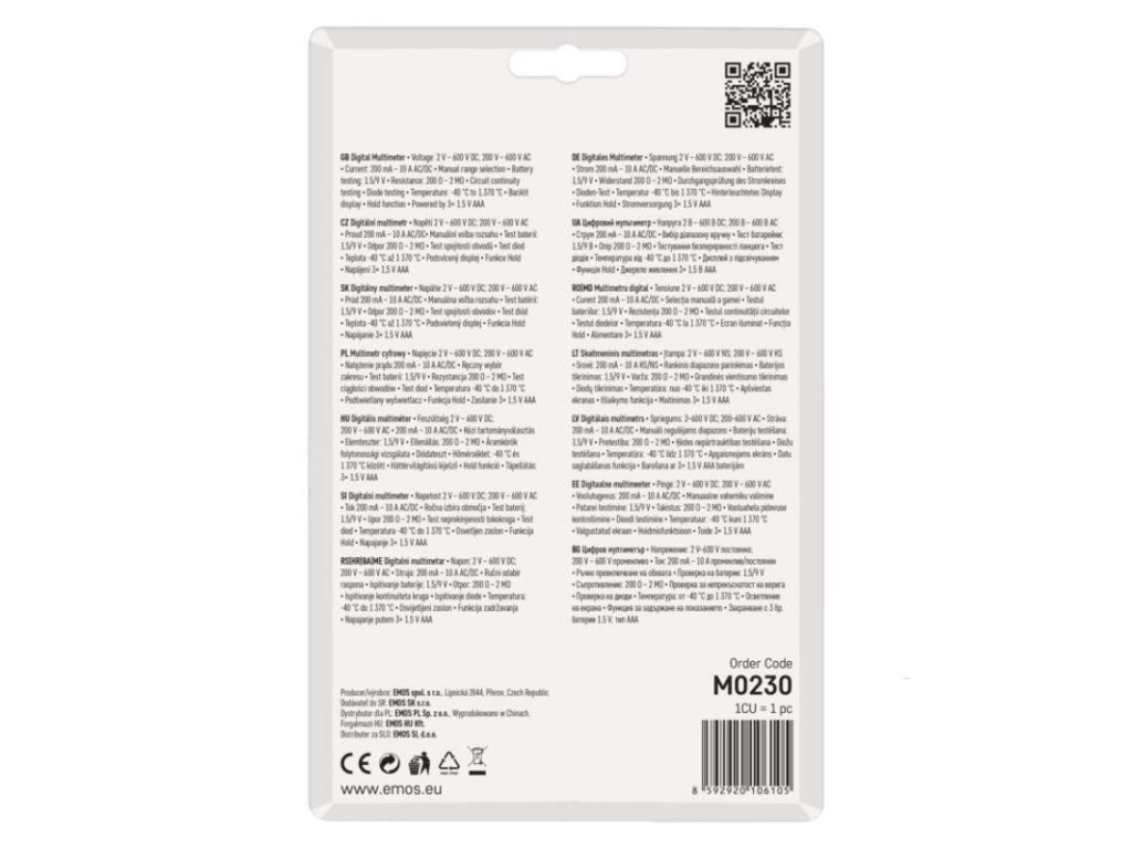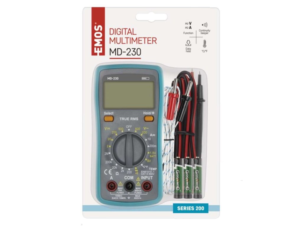 AC napětí: 200–600 V|AC proud: 200 mA – 10 A|automatické vypnutí: ano|bezkontaktní detekce AC napětí: ne|DC napětí: 2–600 V|DC proud: 200 mA – 10 A|elektrický odpor: 200 Ohm – 2 MOhm|indikace slabé baterie: ano|klešťový multimetr: ne|kontaktní detekce AC napětí: ne|měření teploty: -40 °C až +300 °C|napájení: 3× 1,5 V AAA (součástí balení)|podsvícení displeje: ano|prodejní obal: 1 ks, blistr|rozměr: 35 × 75 × 155 mm|součást dodávky: baterie, návod, měřicí hroty, teplotní sonda|spojitost obvodů: ano|test baterií: 1,5 V/9 V|test diod: ano|test tranzistorů: ne|volba rozsahu: manuální|záznam max. hodnoty: ne|záznam naměřené hodnoty: ano|zobrazení displeje: 3,5 digitDoplňkové parametry