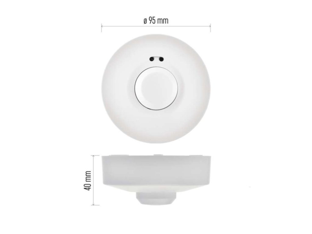 barva: bílá|citlivost: <3 Lux|detekční dosah: 8 m|detekční úhel: 360°|doba sepnutí: min. 10 sekund – max. 12 minut|krytí: IP20|max. zátěž kapacitní: 300 W|max. zátěž odporová: 1 200 W|napájení: 230 V~/50 Hz|prodejní obal: 1 ks, krabička|rozměr: 95 × 95 × 40 mm|typ senzoru: mikrovlnnýDoplňkové parametry