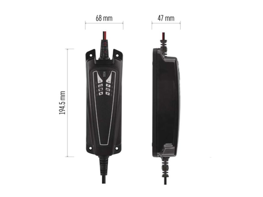 hmotnost: 526 g|indikace nabíjení: LED|kroků nabíjení: 7|krytí: IP65|nabíjecí kabel: 1,8 m je ukončený svorkami|nabíjecí napětí: 7,3 V/14,4 V/14,7 V|nabíjecí proud: 0,8 A +/-10 % / 3,0 A +/-10 % / 4,0 A +/-10 %|nabíjení: 6 V (1,2 Ah–14 Ah), 12 V (1,2 Ah–120 Ah)|ochrana proti zkratu a přepólování: ano|prodejní obal: 1 ks, krabice|program pro chladné počasí: ano|režim desulfatace: ano|řízení nabíjení: řízeno interní MCU, diagnostikuje připojený aku a automaticky jej nabíjí, udržuje, brání přehřátí|udržovací režim: ano|určeno pro: automobily, motocykly, záložní aku, olověné aku WET (kyselinové), MF (bezúdržbové), VRLA, AGM i GEL|vstup: 220–240 V AC/50 Hz/600 mA|výstupní proud: 4 A max.Doplňkové parametry
