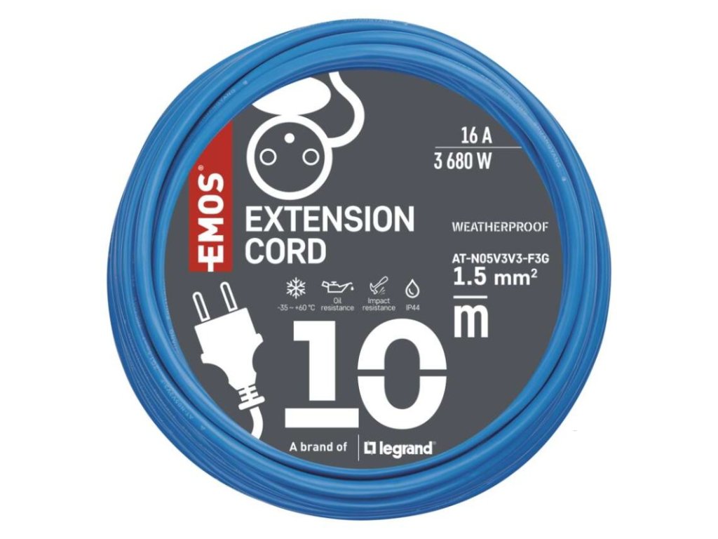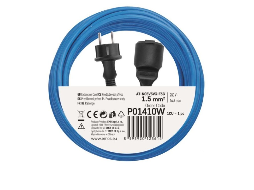 barva kabelu: modrá|další funkce: ne|délka: 10 m|dětské clonky: ano|hmotnost: neuvádí se|krytí: IP44|max. zatížení navinutého: neuvádí se|max. zatížení rozvinutého: 16 A max./3 680 W|napětí: 250 V~|počet zásuvek: 1|prodejní obal: 1 ks, sáček|produkt: prodlužovací přívod – spojka|proud: 16 A|průřez vodiče: 1,5 mm²|rozměr: neuvádí se|tepelná pojistka: ne|typ izolace: PVC|vodič: AT-N05V3V3-F|záruční doba: 2 rokyDoplňkové parametry