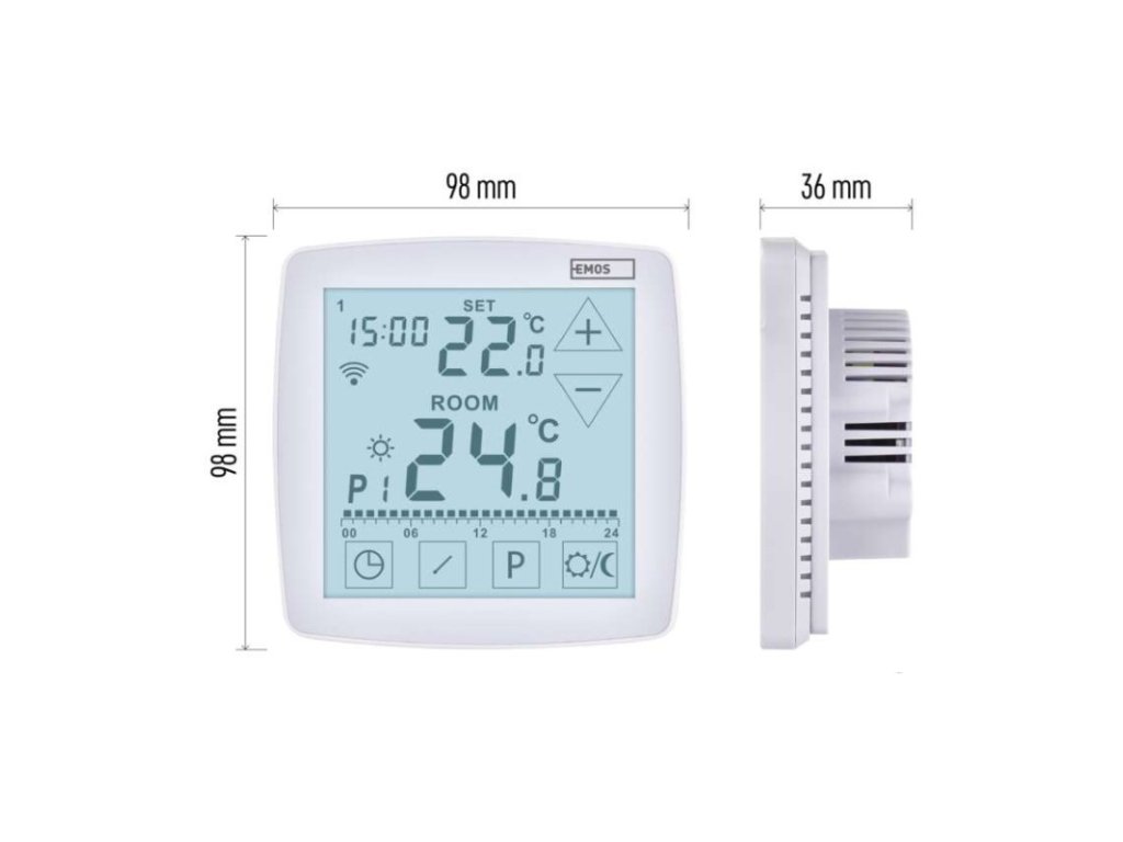 barva: bílá|délka kapilárového čidla: –|dosah ve volném prostoru: –|druh regulace: vytápěcí a chladící systém|funkce ON/OFF: ano|funkce prázdniny: ano|funkce Set-back: ne|jazyky aplikace: EN, CZ, SK, PL, DE, HU, SI, FR, + 60 dalších jazyků|kalibrace teploty: ano|kompatibilita: EMOS GoSmart, TUYA, LIDL, Smartlife, Otevřený systém|měření teploty: 0 °C až 40 °C, rozlišení 0,1 °C|možnost propojení s dalšími detektory: ne|napájení: 230 V AC|napájení brány: –|napájení přijímače: –|napájení vysílače: –|nastavení teploty: 7 °C až 30 °C, po 0,2 °C|nastavitelný rozptyl teploty: 0,1 °C až 1 °C (rozlišení 0,1 °C)|notifikace do mobilní aplikace: ano|ochrana proti zamrznutí: ano|ovládání hlasovými asistenty: ano (Amazon Alexa, Google Assistant)|počet programů: 6 + 3 uživatelsky nastavitelné|podlahové čidlo: NTC 10 kΩ, 3 m|podporované OS: Android, iOS|podsvícený displej: ano|pracovní frekvence: –|přenosová frekvence: 2,4 GHz WIFI (IEEE802.11b/g/n)|prodejní obal: 1 ks, krabička|protokol: Wi-Fi|rozměr: 98 × 37 × 98 mm|rozměr brány: –|rozměr přijímače: –|rozměr vysílače: –|součást balení: termostat, podlahové čidlo 3 m, Ø 8 mm|spínaná zátěž: 16 A odporově, 5 A induktivně|spínání: 230 V AC nebo beznapěťové|typ nastavení teploty: komfortní a úsporná teplota|typ ovládání: programovatelný elektronický pokojový termostat, možnost ovládaní přes mobil (iOS, Android)|typ termostatu: drátový s OpenTherm komunikací + podlahové vytápění, podomítkovýDoplňkové parametry