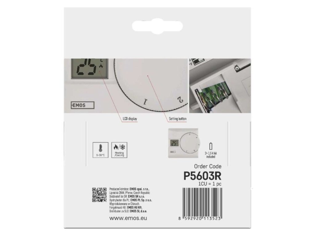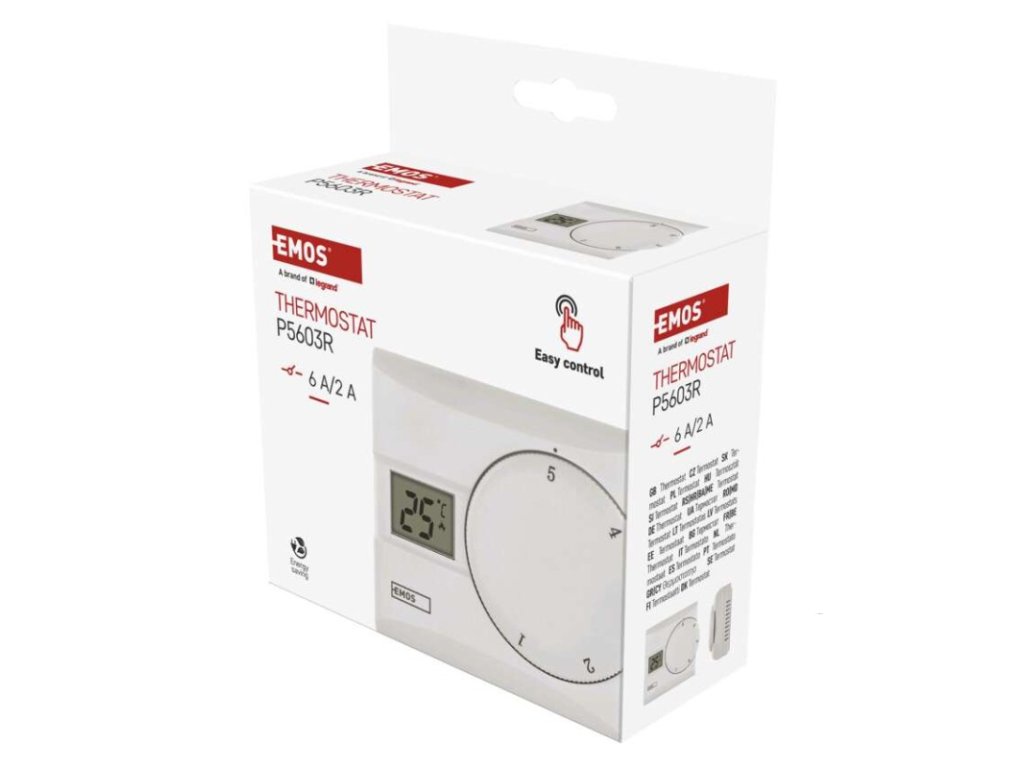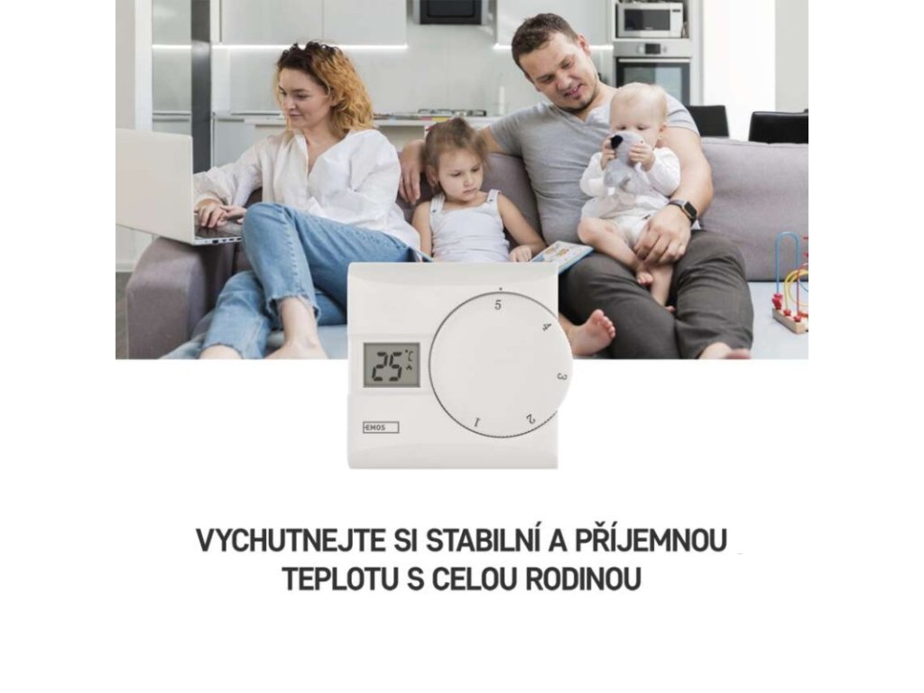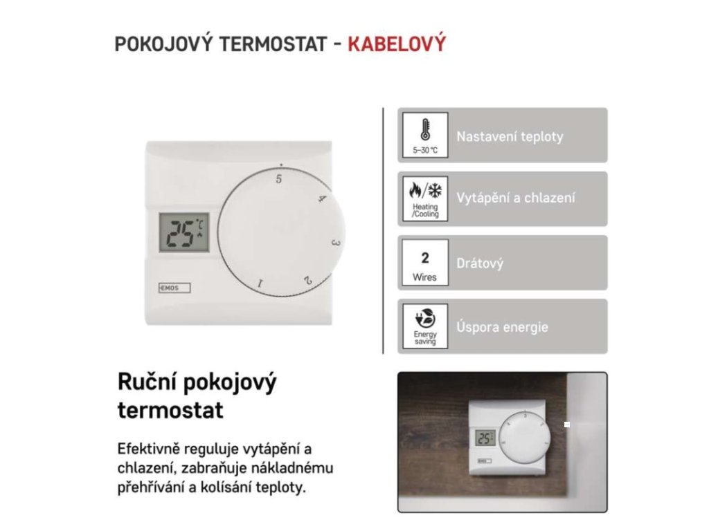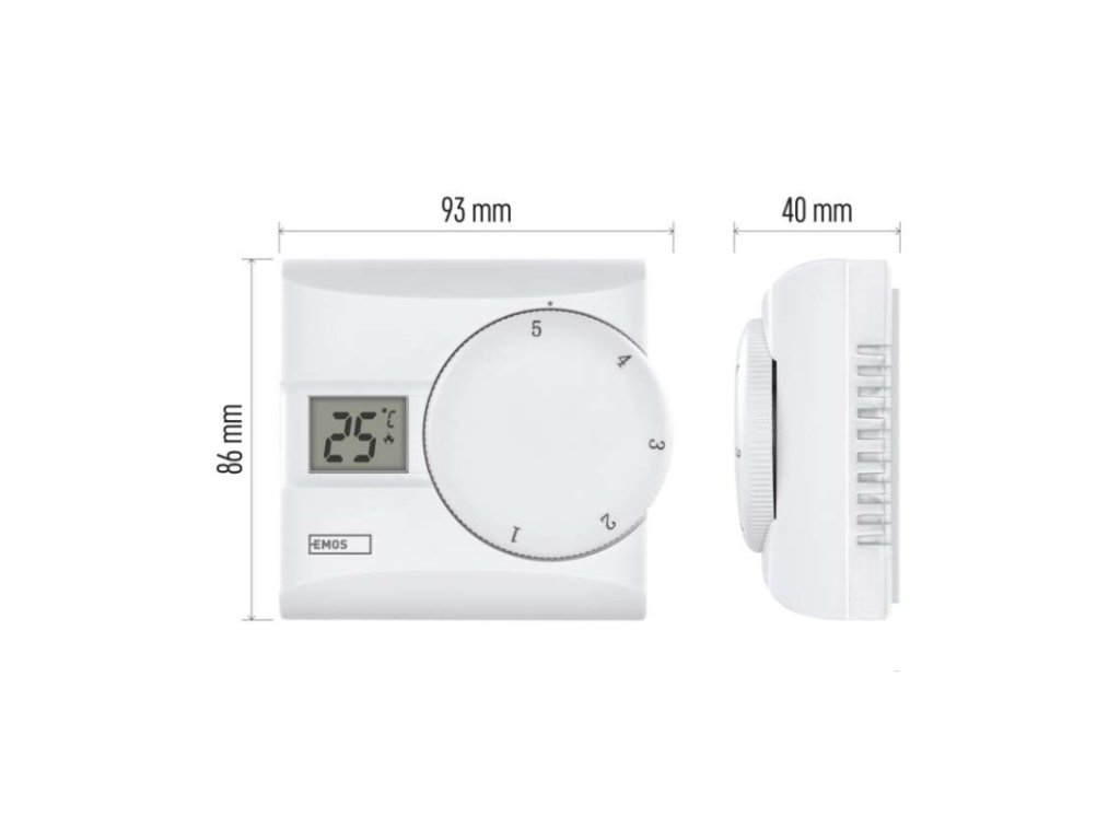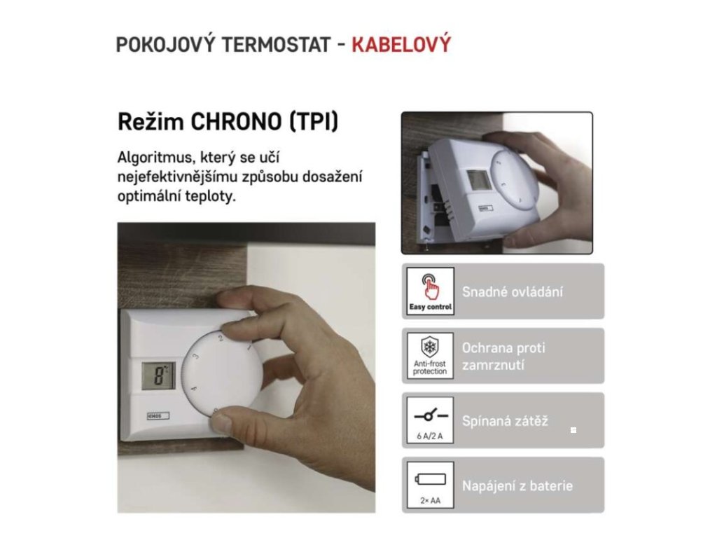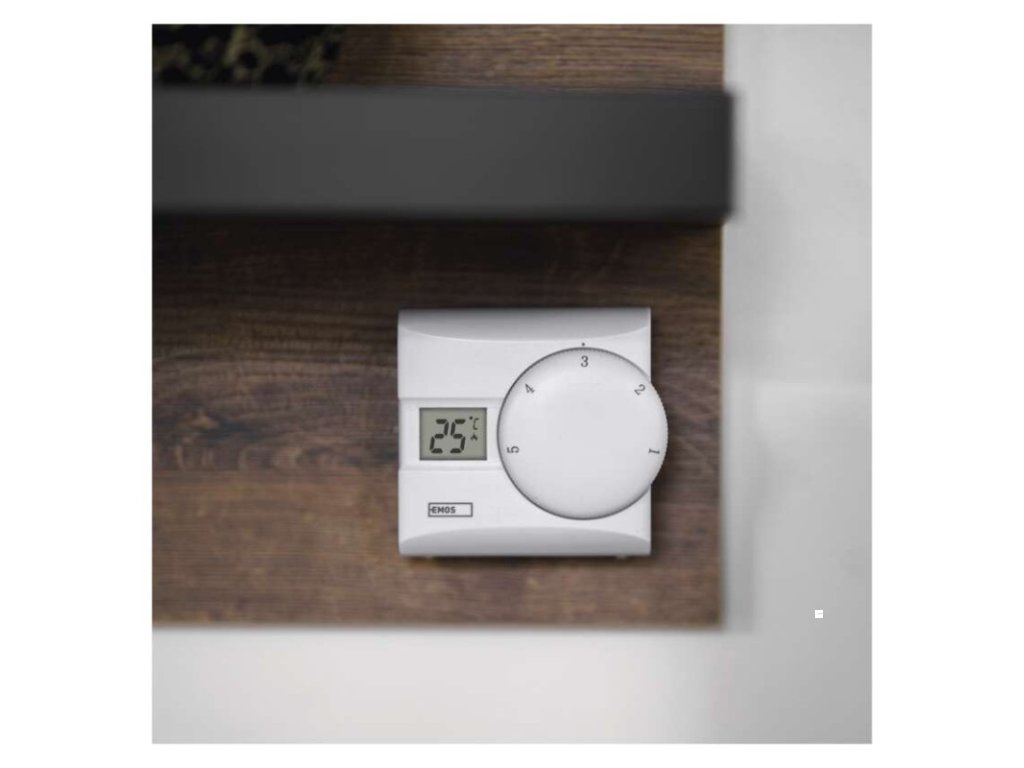 barva: bílá|délka kapilárového čidla: neuvádí se|dosah ve volném prostoru: neuvádí se|druh regulace: vytápěcí a chladící systém|funkce ON/OFF: ne|funkce prázdniny: ne|funkce Set-back: ne|kalibrace teploty: ne|měření teploty: 0 °C až 40 °C, rozlišení 1 °C|možnost propojení s dalšími detektory: neuvádí se|napájení: 2× 1,5 V AA (součástí dodávky)|napájení brány: neuvádí se|napájení přijímače: neuvádí se|napájení vysílače: neuvádí se|nastavení teploty: 5 °C až 30 °C, po 1 °C|nastavitelný rozptyl teploty: 0,4 °C|ochrana proti zamrznutí: ano|počet programů: uživatelsky nastavitelná teplota|podsvícený displej: ne|pracovní frekvence: neuvádí se|prodejní obal: 1 ks, krabička|protokol: –|rozměr: 40 × 93 × 86 mm|rozměr brány: neuvádí se|rozměr přijímače: neuvádí se|rozměr vysílače: neuvádí se|součást balení: neuvádí se|spínaná zátěž: 6 A odporově, 2 A induktivně|spínání: 230 V AC nebo beznapěťové|typ nastavení teploty: manuálně|typ ovládání: manuální pokojový termostat|typ termostatu: drátovýDoplňkové parametry